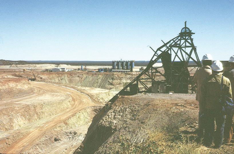 Figure 4 The Sons of Gwalia in 1985, about one year after the mine was redeveloped as an open pit. The head frame, here poised on the edge of the pit, was later moved to a museum display,