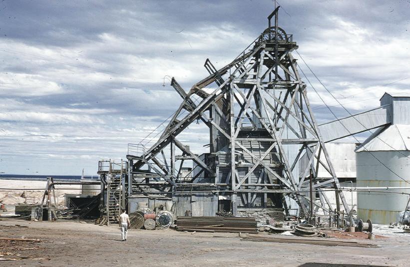 The first illustration (Figure 2) in the following series shows the mine, as photographed by GSWA geologist, CFV Jackson, just five years after it was established by Herbert Hoover. The second shows the mine’s head frame in 1961 looking much the same as Hoover’s original, although some modifications are apparent. The third, taken one year after the mine was reopened, shows the head frame poised on the edge of the newly created open pit a short time before it was removed to a museum area. The final picture is artist Lyn Barry’s impression of the mine in about 2005 when the only signs of life were three goats browsing on the sparse vegetation alongside the abandoned open pit.