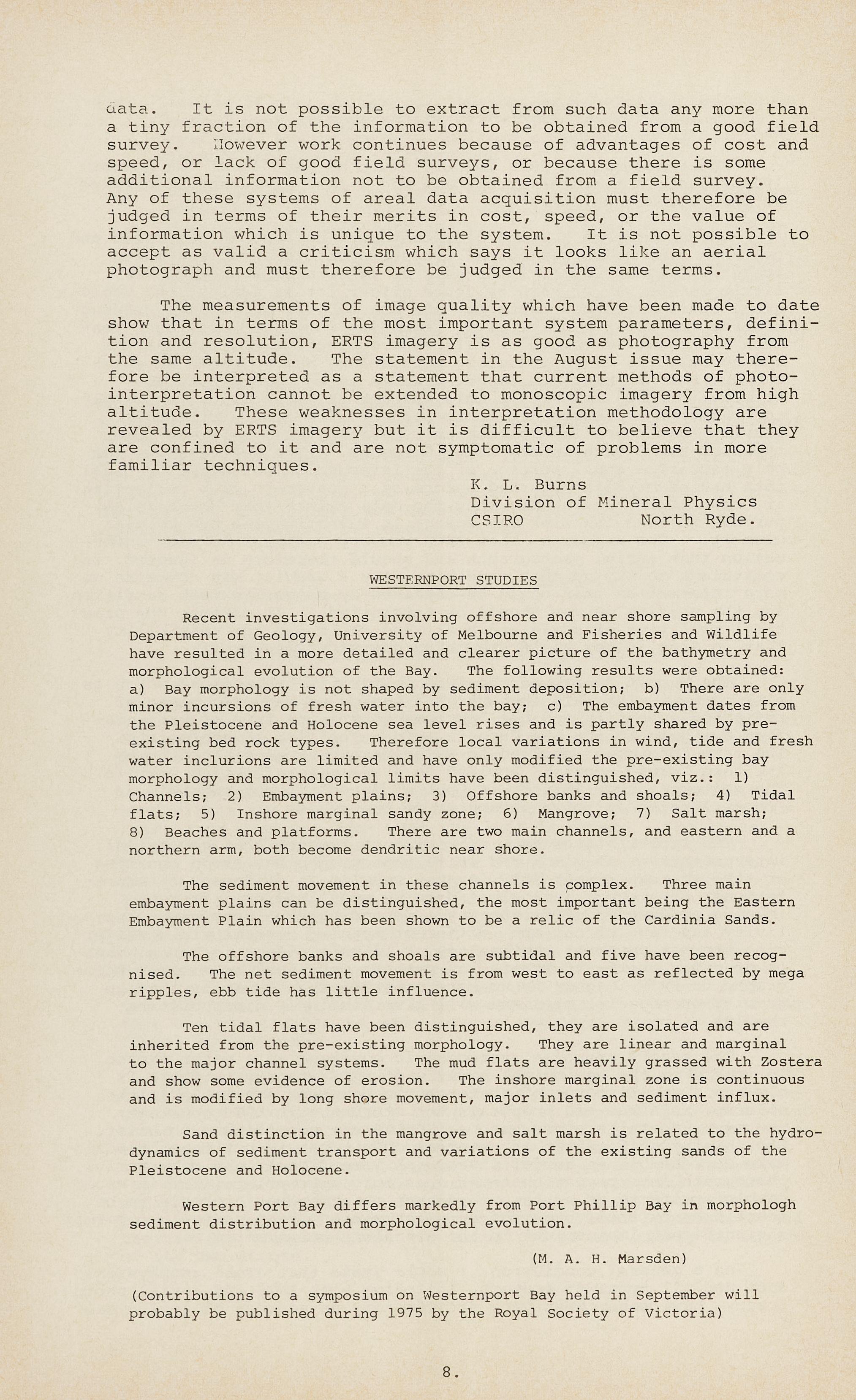 (Contributions to a symposium on Westernport Bay held in September will probably be published during 1975 by the Royal Society of Victoria)