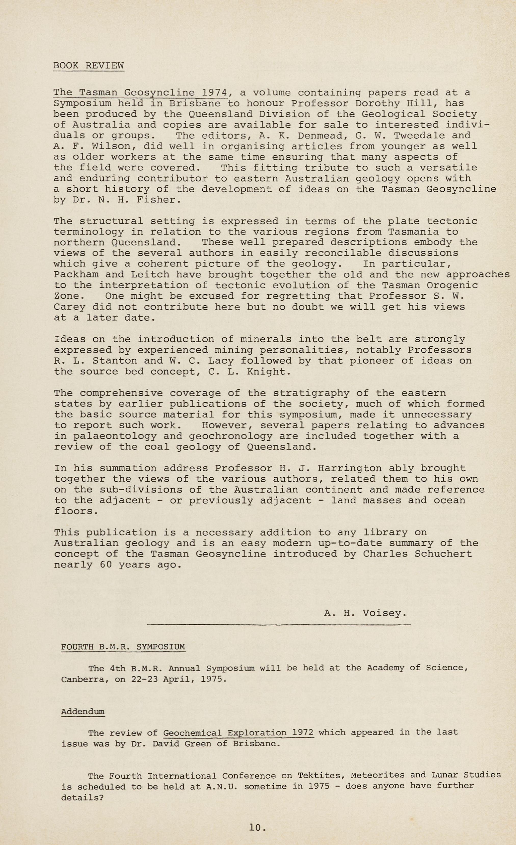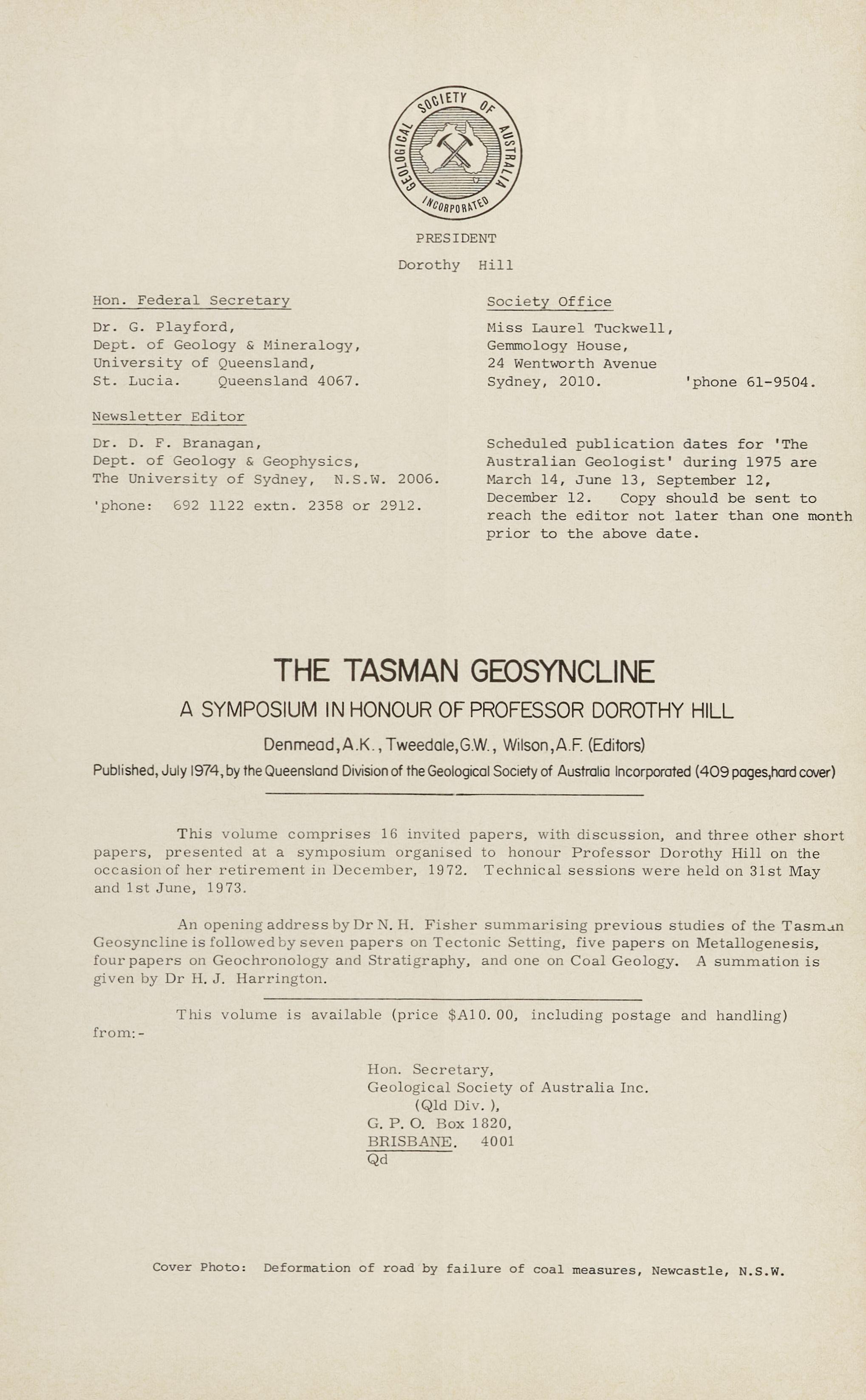The Tasman Geosyncline 1974, a volume containing papers read at a Symposium held in Brisbane to honour Professor Dorothy Hill, has been produced by the Queensland Division of the Geological Society of Australia and copies are available for sale to interested individuals or groups. The editors, A. K. Denmead, G. W. Tweedale and A. F. Wilson, did well in organising articles from younger as well as older workers at the same time ensuring that many aspects of the field were covered. This fitting tribute to such a versatile and enduring contributor to eastern Australian geology opens with a short history of the development of ideas on the Tasman Geosyncline by Dr. N. H. Fisher.