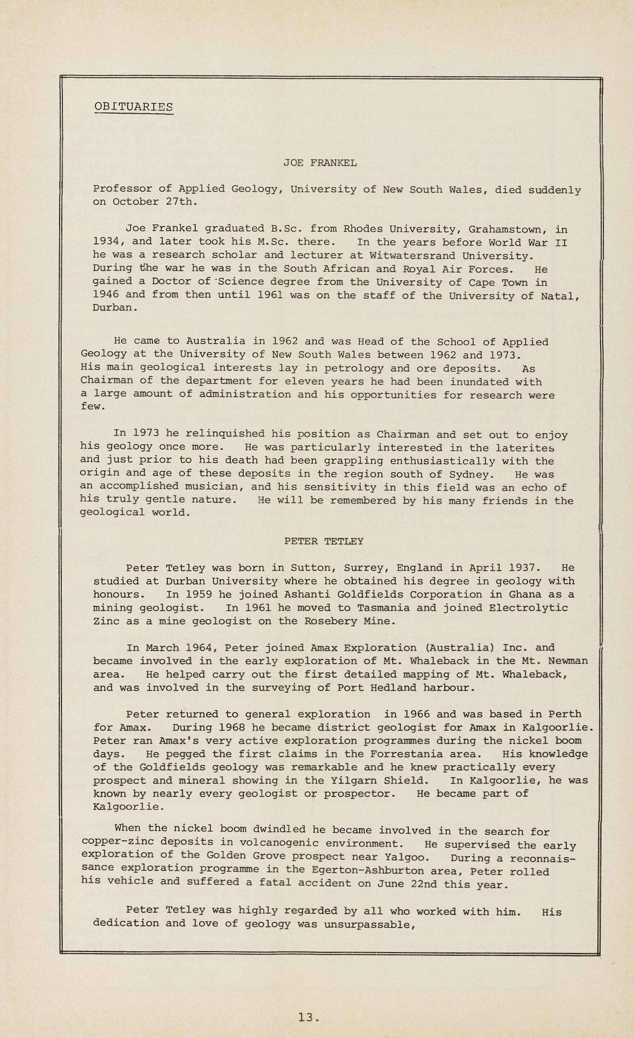 Peter Tetley was highly regarded by all who worked with him. His dedication and love of geology was unsurpassable,