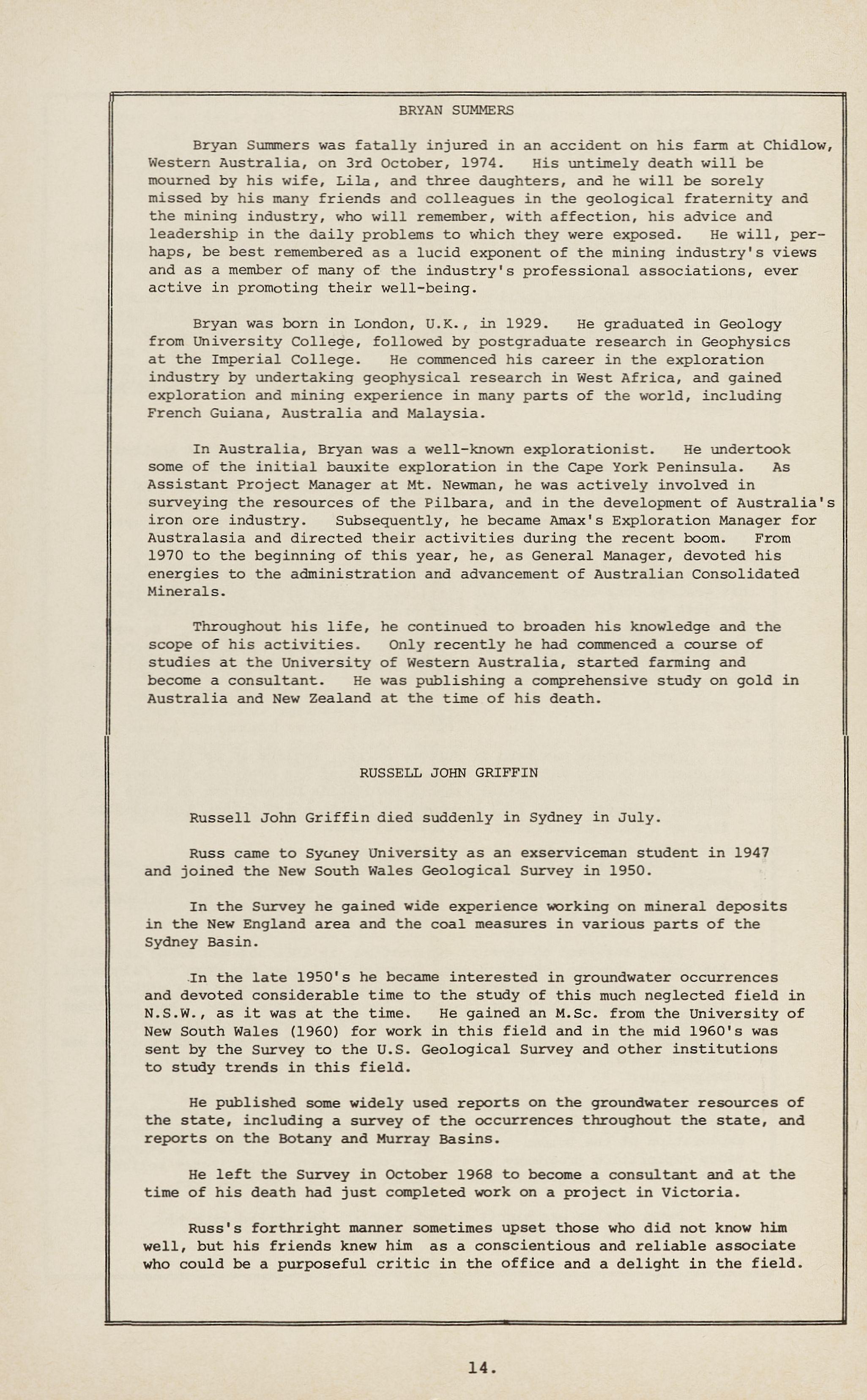 Bryan Summers wa s fatally injured in an accident on his farm at Chidlow, Western Australia, on 3rd October, 1974. His untimely death will be mourned by his wife, Lila, and three daughters, and he will be sorely missed by his many friends and colleagues in the geological fraternity and the mining industry, who will remember, with affection, his advice and leadership in the daily problems to which they were exposed. He will, perhaps, be best remembered as a lucid exponent of the mining industry's views and as a member of many of the industry's profes siona l associations, ever active in promoting their well-being.