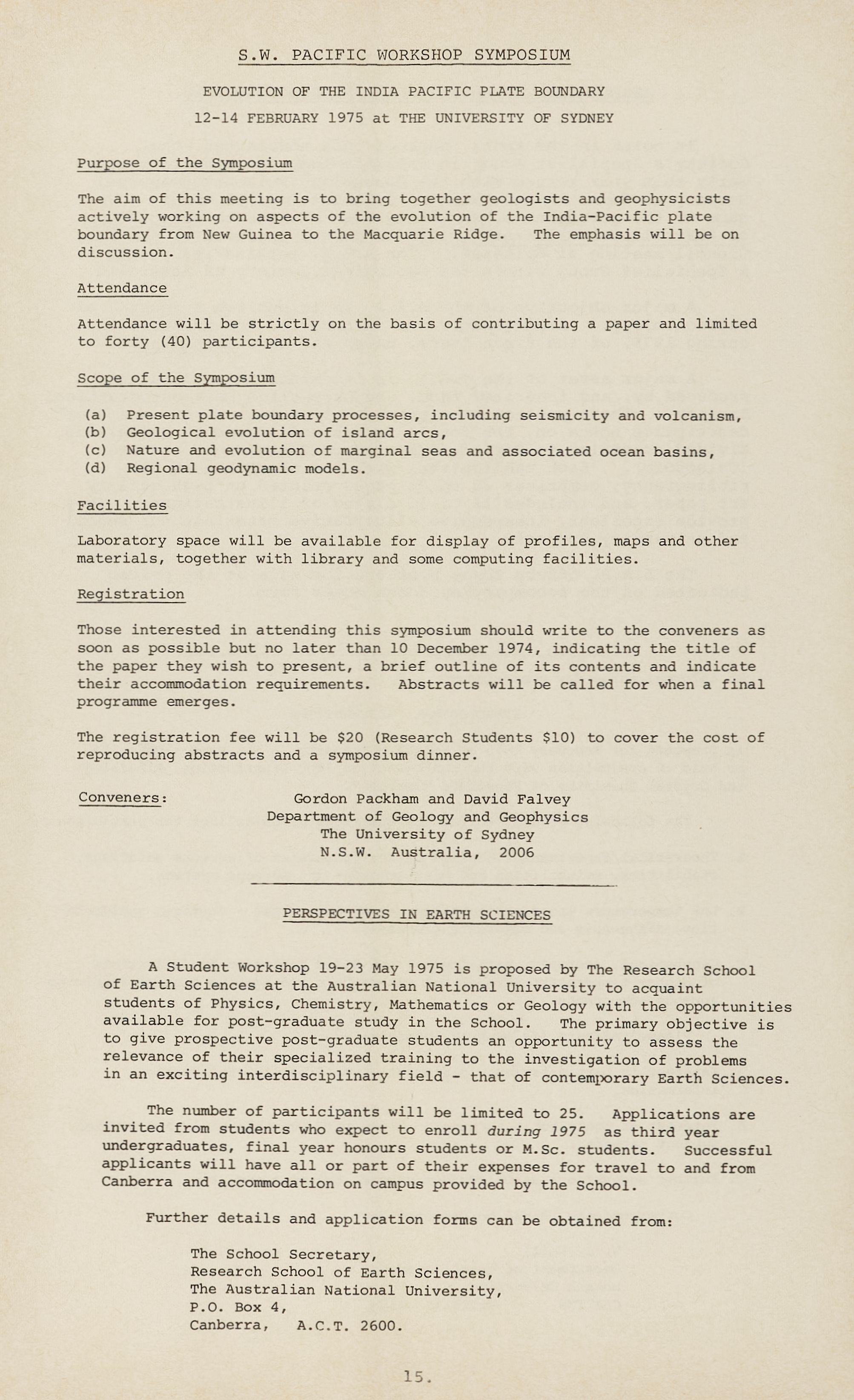 A Student Workshop 19-23 May 1975 is proposed by The Research School of Earth Sciences at the Australian National University to acquaint students of Physics, Chemistry, Mathematics or Geology with the opportunities available for post-graduate study in the School. The primary objective is to give prospective post-graduate students an opportunity to assess the relevance of their specialized training to the investigation of problems in an exciting interdisciplinary field - that of contemporary Earth Sciences.
