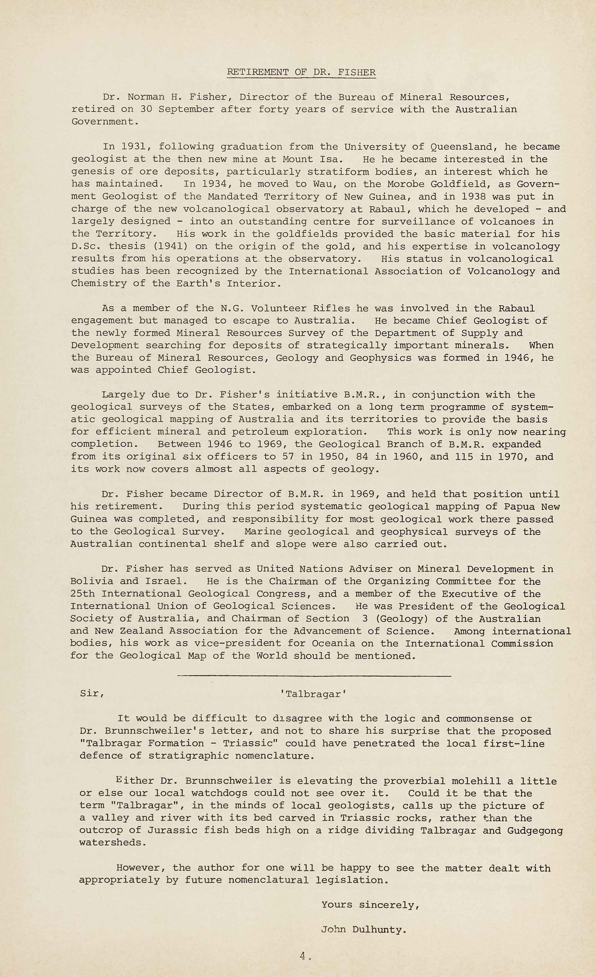 Dr. Norman H Fisher, Dir e ctor of the Bureau of Mineral Resources, retired o n 30 S e ptember after forty ye ars of service with the Australian Government.