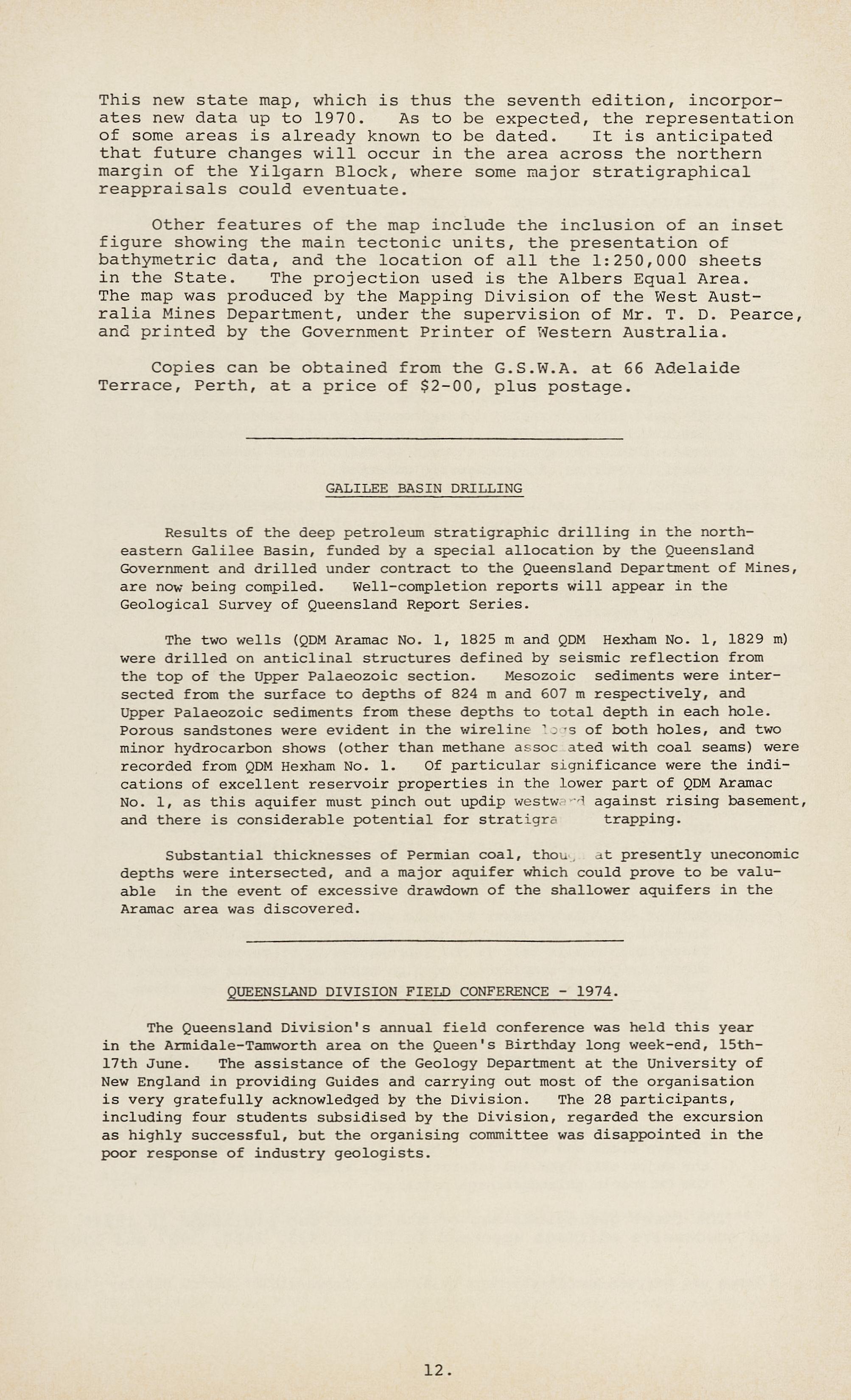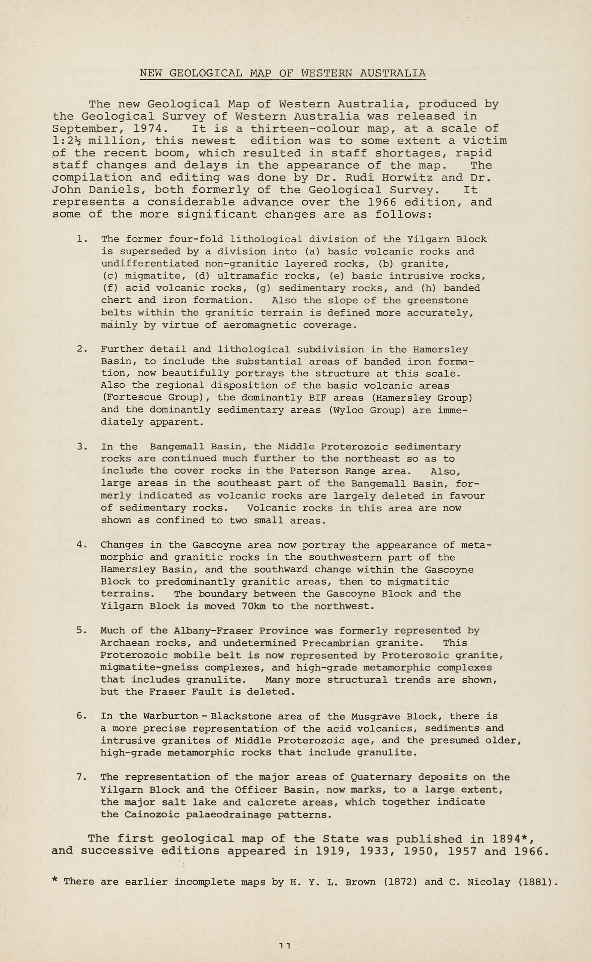 The new Geological Map of Western Australia, produced by the Geological Survey of Western Australia was released in September, 1974. It is a thirteen-colour map, at a scale of 1:2½ million, this newest edition was to some extent a victim pf the recent boom, which resulted in staff shortages, rapid staff changes and delays in the appearance of the map. The compilation and editing was done by Dr. Rudi Horwitz and Dr. John Daniels, both formerly of the Geological Survey. It represents a considerable advance over the 1966 edition, and some of the more significant changes are as follows: