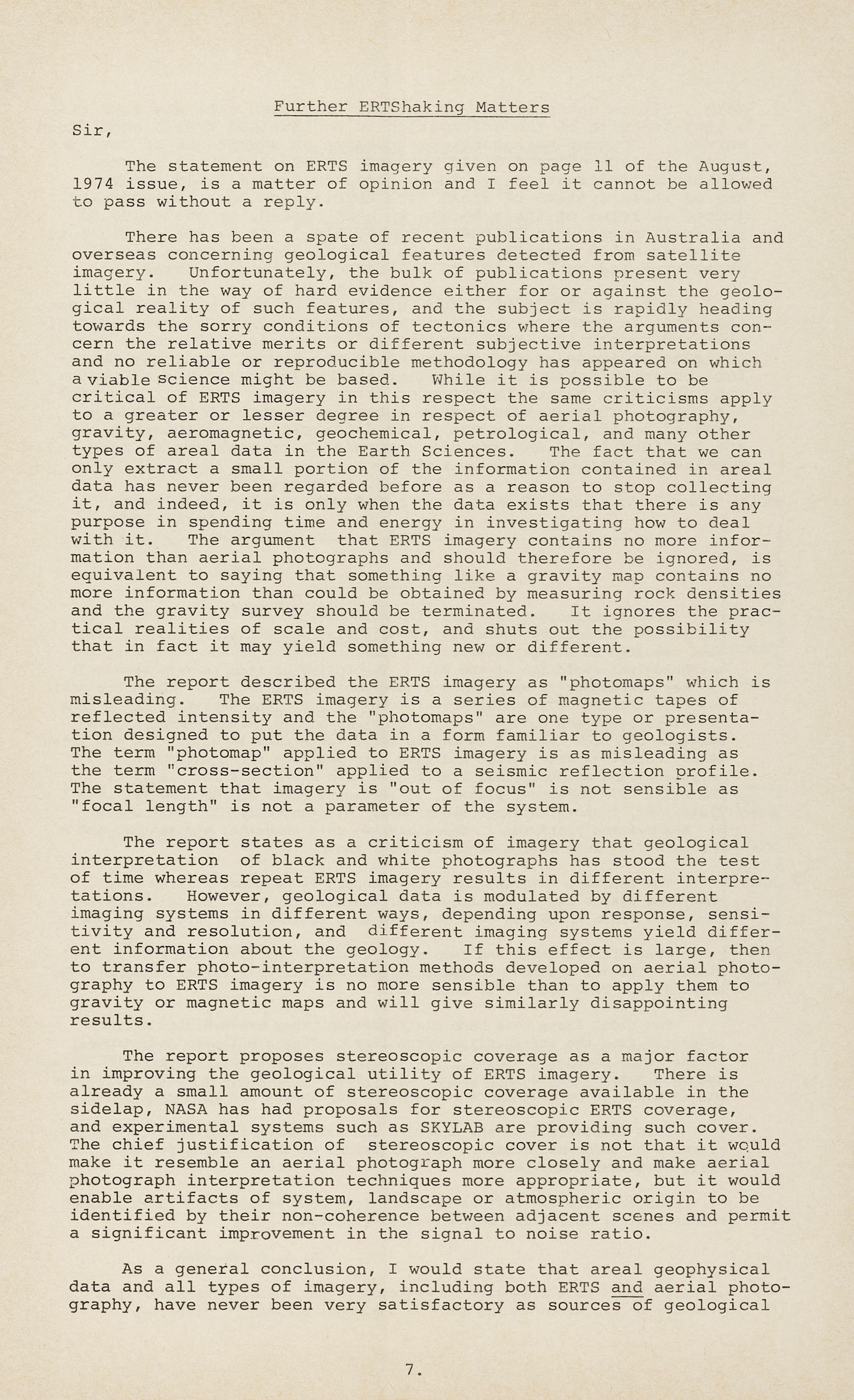 The statement on ERTS imagery given on page 11 of the August , 1974 issue, is a matter of opinion and I feel it ca nnot be allowed t o pass without a reply.