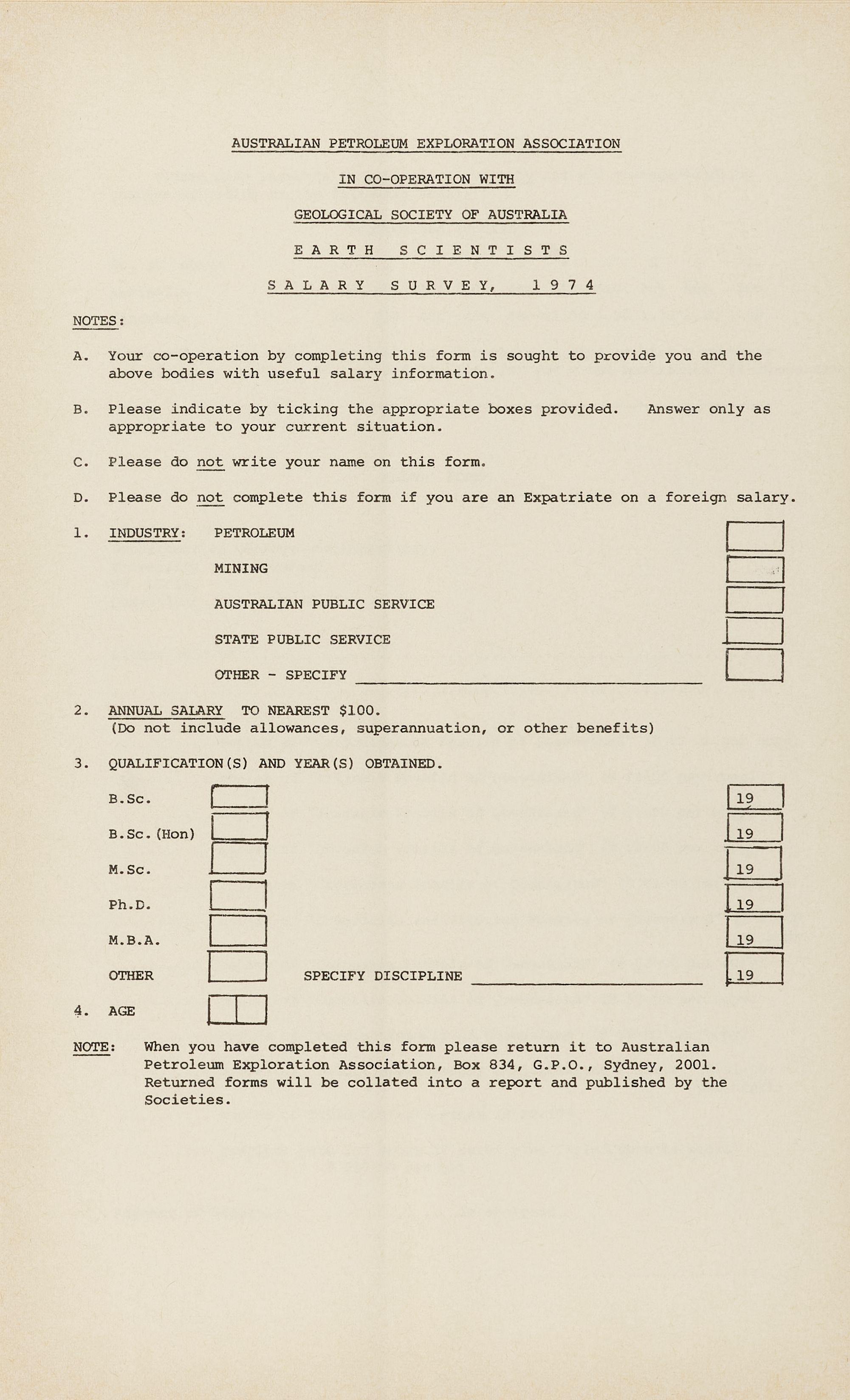 When you have completed this form please return it to Australian Petroleum Exploration Association, Box 834, G P.O., Sydney, 2001. Returned forms will be collated into a report and published by the Societies.