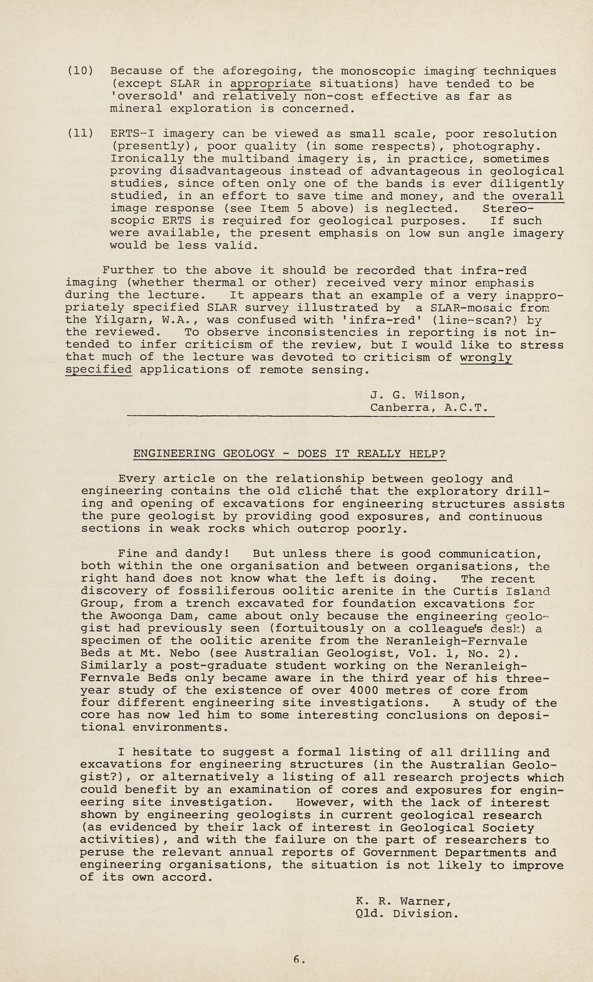 Further to the above it should be recorded that infra-red imaging (whether thermal or other) received very minor emphasis during the lecture. It appears that an example of a very inappropriately specified SLAR survey illustrated by a SLAR-mosaic from the Yilgarn, W.A., was confused with 'infra-red' (line-scan?) by the reviewed. To observe inconsistencies in reporting is not intended to infer criticism of the review, but I would like to stress that much of the lecture was devoted to criticism of wrongly specified applications of remote sensing.