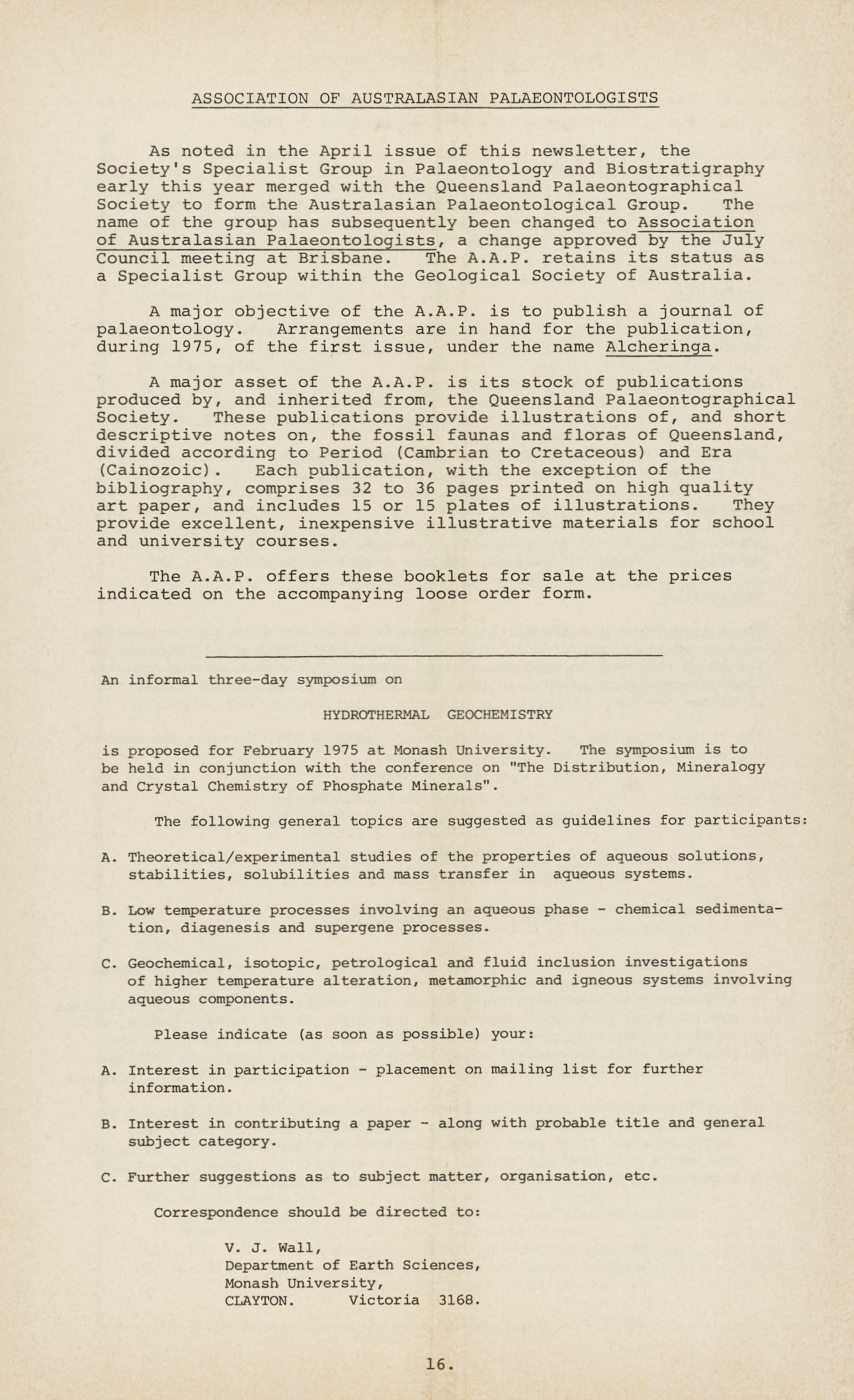 At its August Meeting, Council voted funds for the 'Australian Geologist' to continue during 1975. Although not without some opposition, there seems to be majority support from members for such a newsletter. For the moment at least we have slightly more material than can be printed, for which I must thank numerous correspondents. However such abundance can very soon turn to famine and I would appreciate any material, but particularl y short reviews on any geological topics for forthcoming issues.