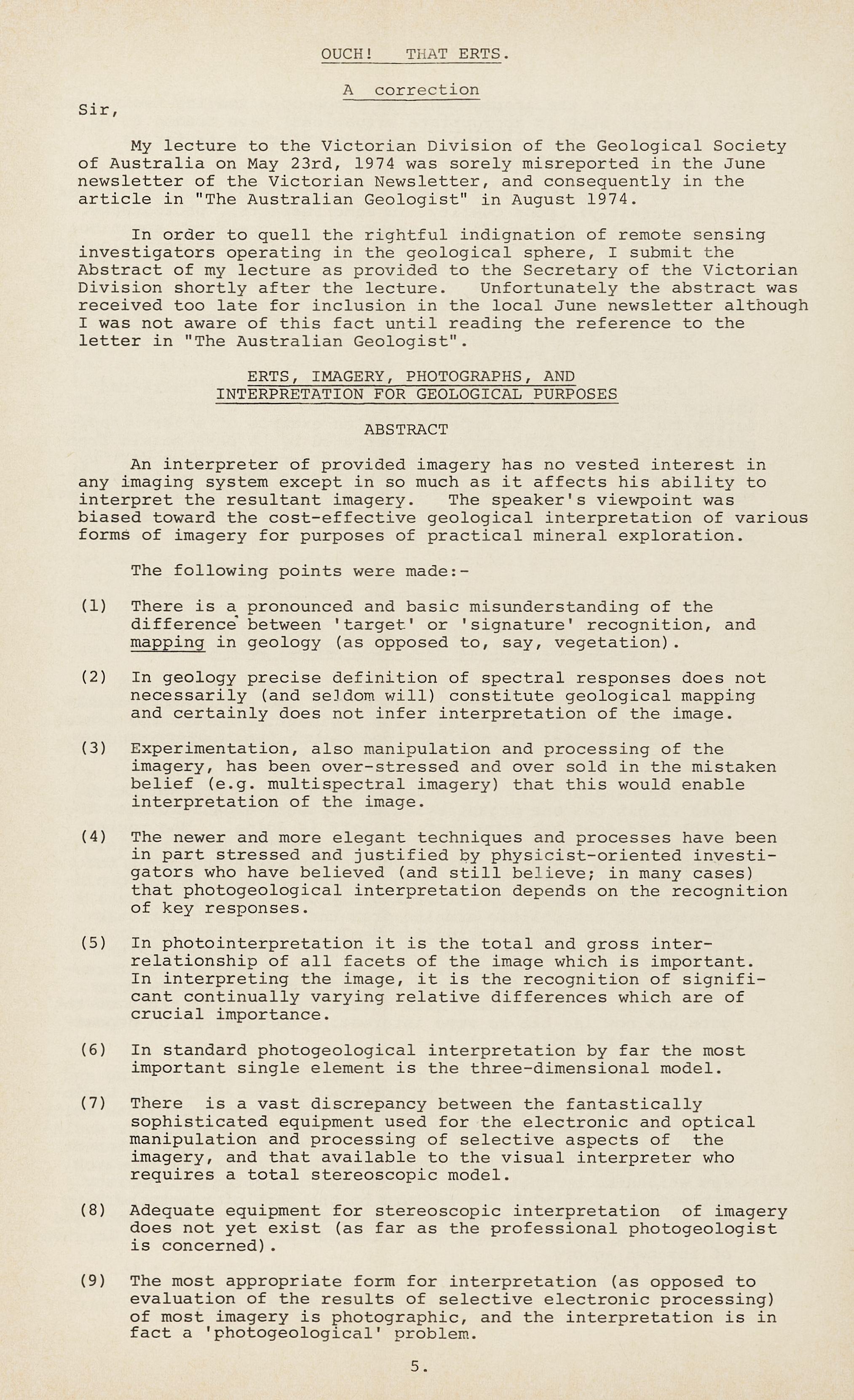 In order to quell th e ri g htful indignation of remot e se nsing investigators operatin g i n the g e ological sphere, I submit t h e Abstract of my lecture as p rov i d e d to t h e Se cretar y of the Victorian Division shortl y after th e lecture . Unfo r tun atel y the abstract was received too late for inclusio n i n t h e loca l June n e wsletter althoug h I was not aware of t h is fact u n til reading the r e ference to the letter in "The Australia n Ge olo g ist "