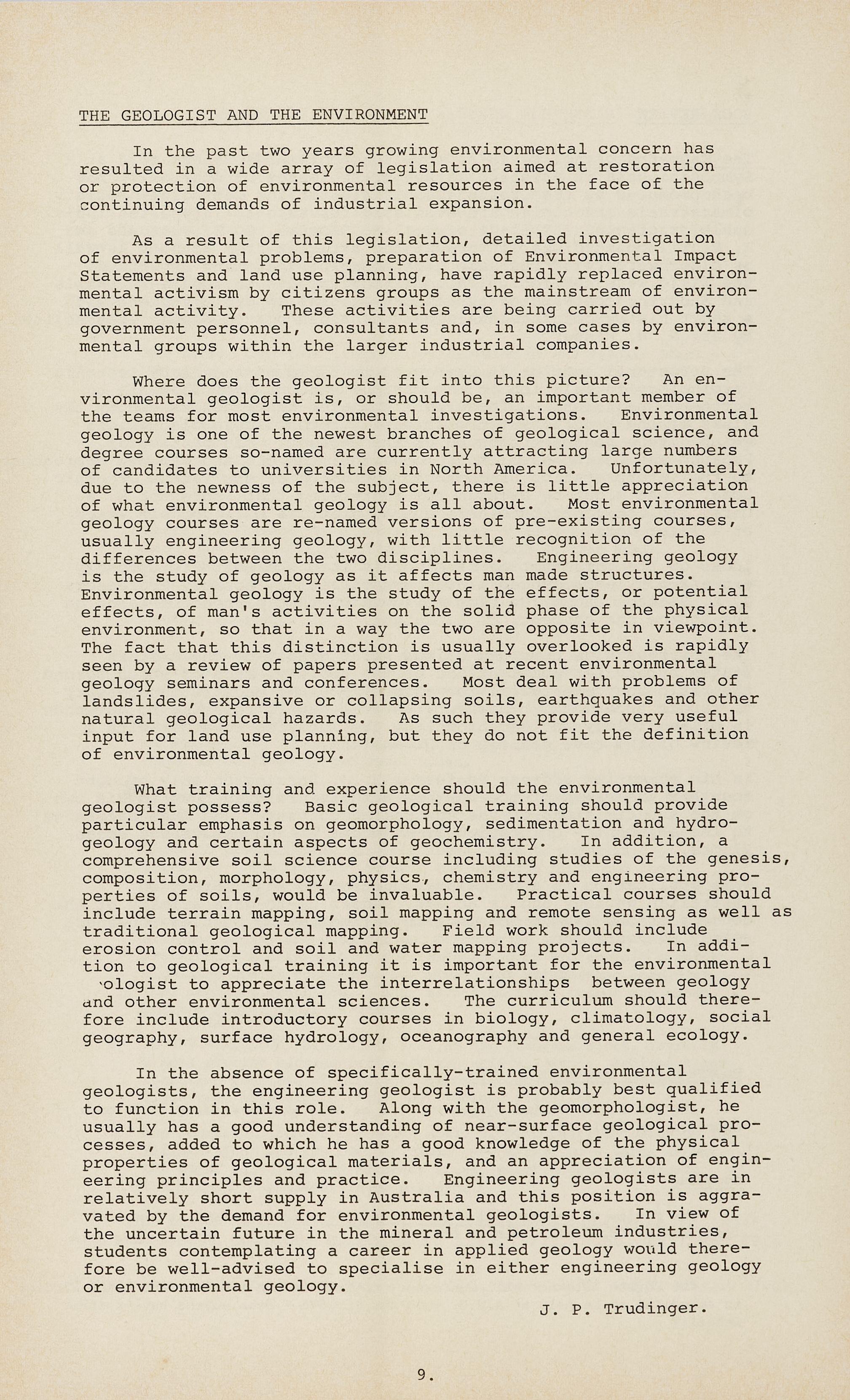 In the absence of specifically-trained environmental geologists, the engineering geologist is probably best qualified to function in this role. Along with the geomorphologist, he usually has a good understanding of near-surface geological processes, added to which he has a good knowledge of the physical properties of geological materials, and an appreciation of engineering principles and practice. Engineering geologists are in relatively short supply in Australia and this position is aggravated by the demand for environmental geologists. In view of the uncertain future in the mineral and petroleum industries, students contemplating a career in applied geology would therefore be well-advised to specialise in either engineering geology or environmental geology.
