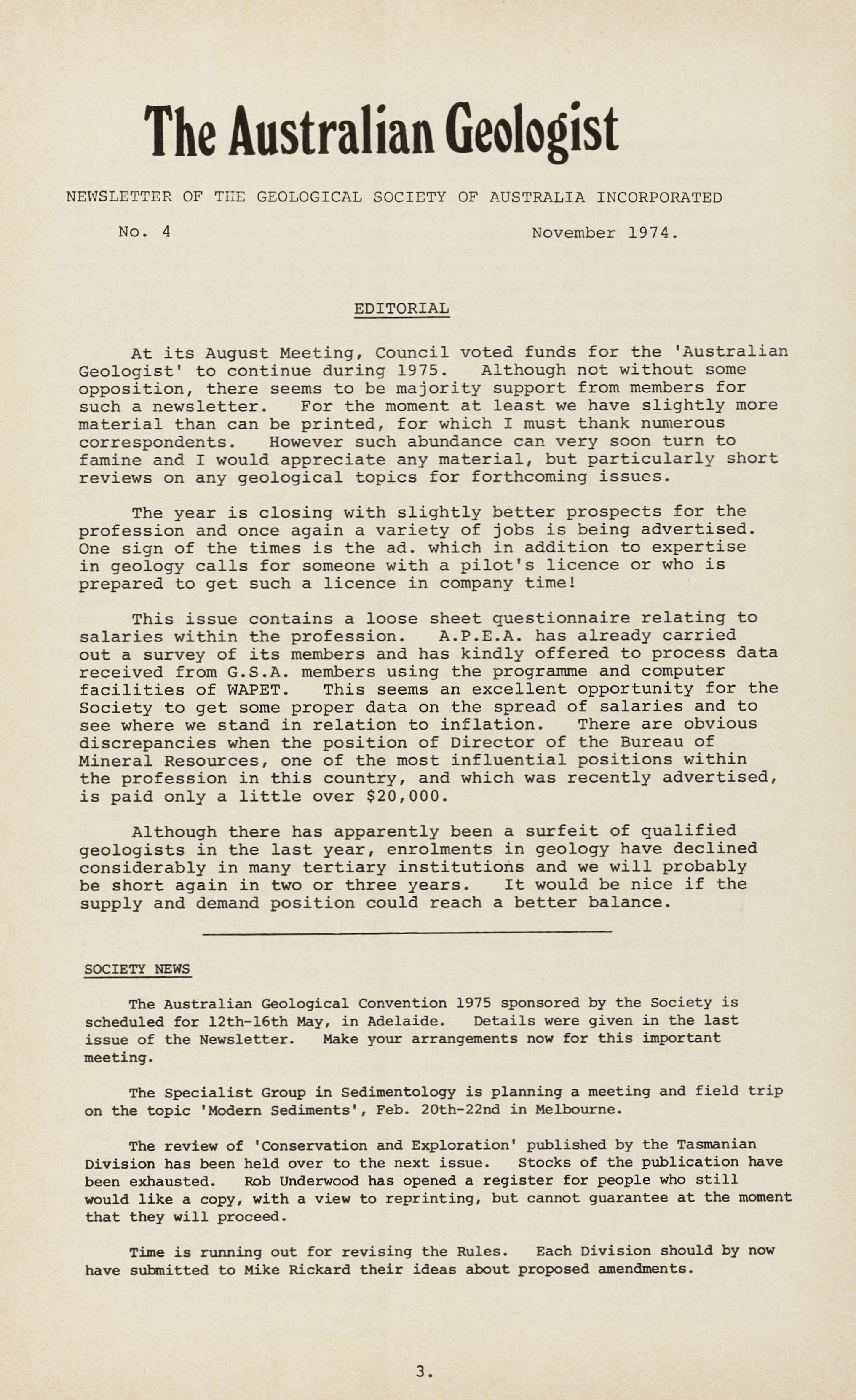 This issue contains a loose sheet questionnaire relating to salaries within the profession. A.P.E.A. has already carried out a survey of its members and has kindly offered to process data received from G.S.A. members using the programme and computer facilities of WAPET. This seems an excellent opportunity for the Society to get some proper data on the spread of salaries and to see where we stand in relation to inflation. There are obvious discrepancies when the position of Director of the Bureau of Mineral Resources, one of the most influential positions within the profession in this country, and which was recently advertised, is paid only a little over $20,000.