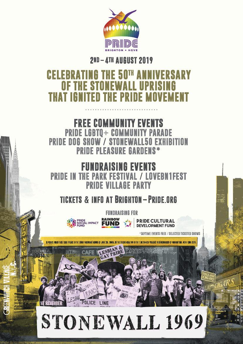 The Brighton & Hove Pride Festival, which will take pace from August 2-4, will commemorate the 50th anniversar y of the Stonewall uprising that ignited the Pride Movement by taking a look back over five decades of pride, passion, diversity and activism, to celebrate how far we have come whilst recognising there’s still more work to be done