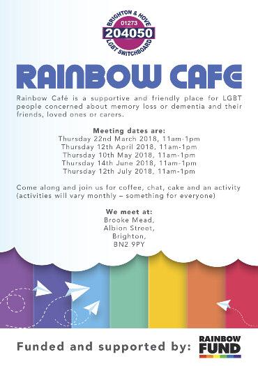 The Rainbow Café will run monthly with the next meeting taking place 11am-1pm on Thursday, March 21 at Brooke Mead, Albion Street, Brighton To find about more about the Rainbow Café, email: rainbow cafe@switchboard org uk or call the Switchboard office on 01273 234009