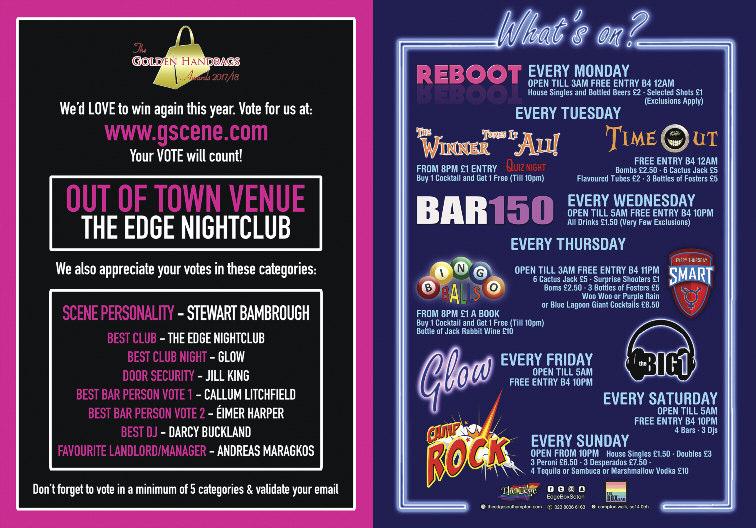 All work appearing in Gscene Ltd is copyright It is to be assumed that the copyright for material rests with the magazine unless otherwise stated on the page concerned No part of this publication may be reproduced, stored in an electronic or other retrieval system, transmitted in any form or by any means, electronic, mechanical, photocopying, recording or otherwise without the prior knowledge and consent of the publishers The appearance of any person or any organisation in Gscene is not to be construed as an implication of the sexual orientation or political persuasion of such persons or organisations