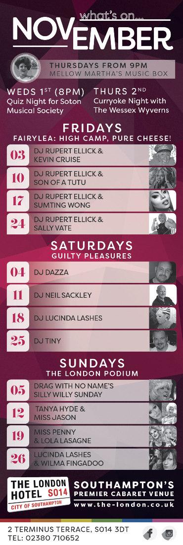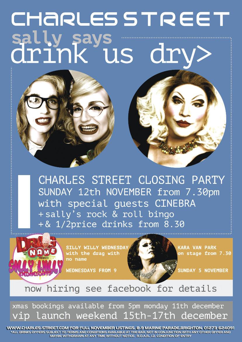 After 17 years being a main stay of the Brighton LGBT+ commercial scene, Charles Street bar will be holding a closing down par ty from 7.30pm on Sunday, November 12 called “Sally says - Drink Us Dr y!” with special guest cabaret from Cinebra