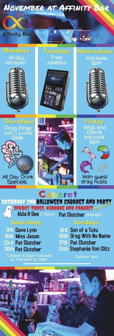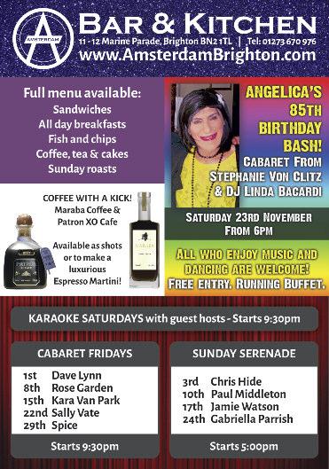 ) Get your dancing shoes on for local scene personality Angelica’s 85th Bir thday Bash at the Amsterdam Bar & Kitchen, Brighton on Saturday, November 23 from 6pm There’ll be a running buffet, cabaret from the sensational Stephanie Von Clitz and tunes cour tesy of DJ Linda Bacardi Entry is free, and all those who enjoy music and dancing are welcome