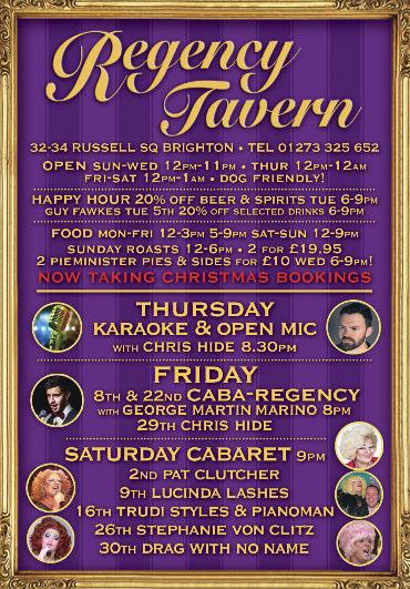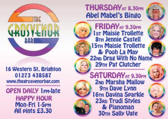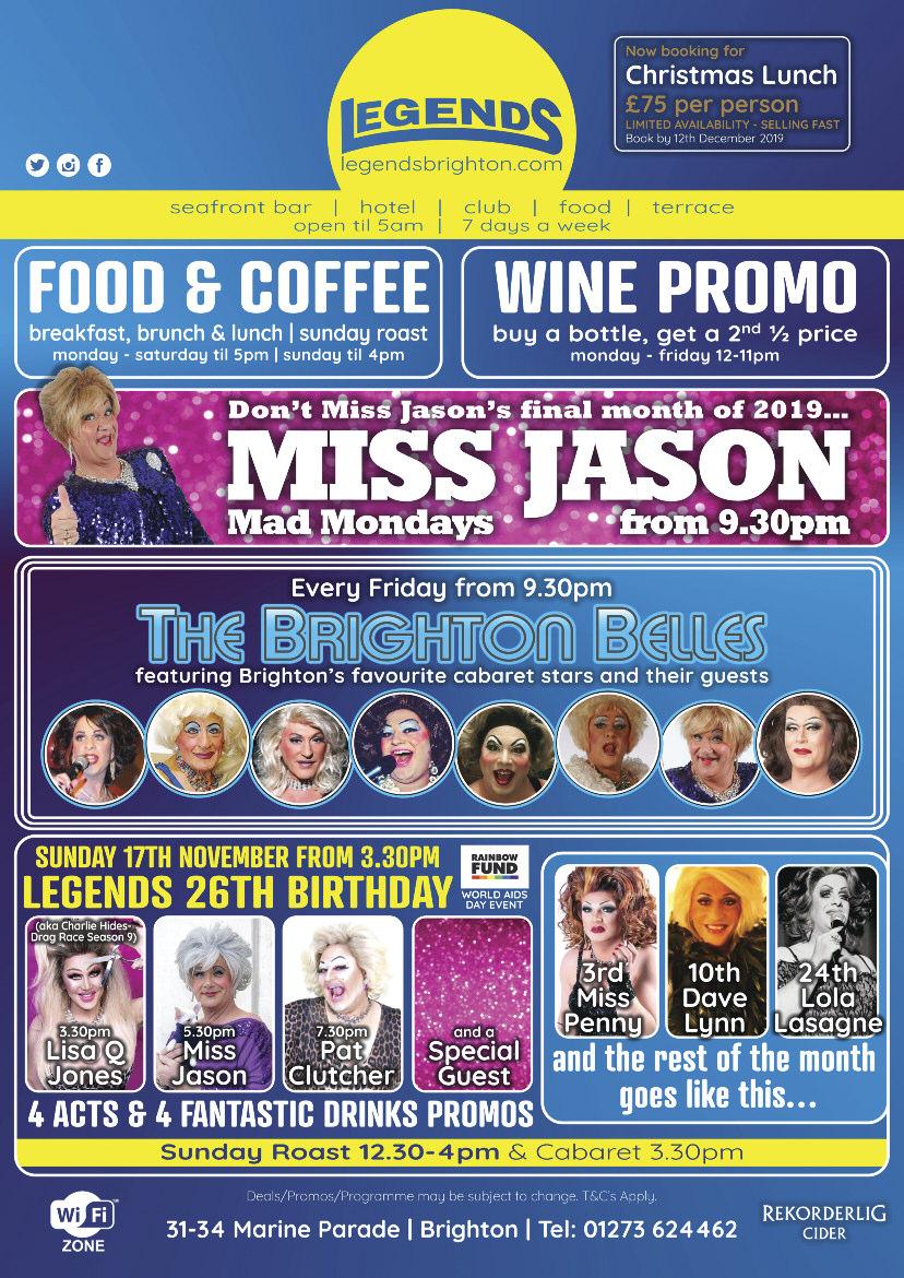 ) Legends Brighton celebrate their 26th Bir thday with a World AIDS Day fundraiser for the Brighton R ainbow Fund on Sunday, November 17 from 3.30pm Join a line-up of top flight cabaret acts as they make a scene on the scene: Lisa Q Jones, owner of the Curl Up & Dye hair salon will ‘blow you away’ from 3.30pm; the iconic Miss Jason will bring camp & cheer, dear at 5.30pm; Pat Clutcher will lay her Nor thern, damaged, soul bare from 7.30pm If that’s not enough, they’ll be joined by an extra special guest and there’ll be four fantastic drink promos so get there before the queens drink the bar dry