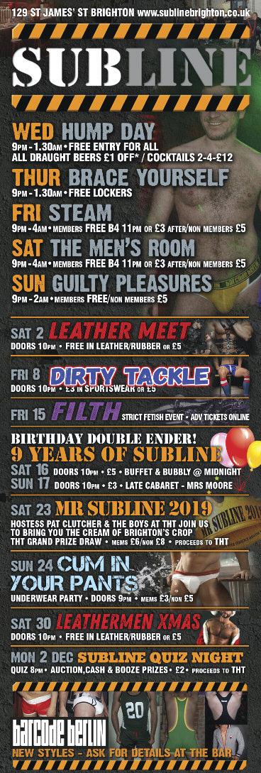 On Saturday, November 23, Subline is once again proud to present Mr Subline 2019 In association with Terrence Higgins Trust (THT), the Subline team invites the cream of Brighton and of course fur ther afield to compete for the title in an evening hosted by Pat Clutcher Entrants include bears, cubs, kinky rubber fellas, and pretty boys; all types are eligible Doors open at 9pm, and contestants will be taken in hand by Ms Clutcher at 10 30pm, who will put all through their paces