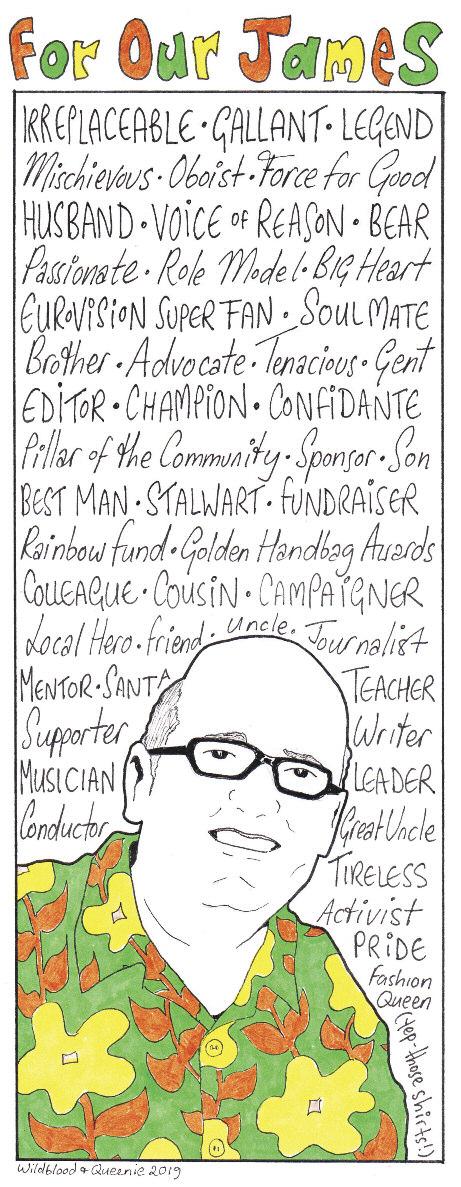 James was never closeted He was always out and proud James believed in fundamental fairness and used Gscene to give voice to people without his own privilege, to platform views which were right and fair, to give space to voices not often heard on the commercial gay scene He was a formidable adversary, with a researched journalist attitude to telling truth to power James judged you on what you did, not on what you said Actions not words Outcomes not promises He worked to ensure that the voices of LGBTQ+ people were given space to be heard and their concerns, par ticularly around HIV, health and diversity, were acted on He was tireless in his commitment to the community, unstinting in his commitment to constructing an infrastructure for LGBTQ+ people, provided by LGBTQ+ groups We live in his legacy