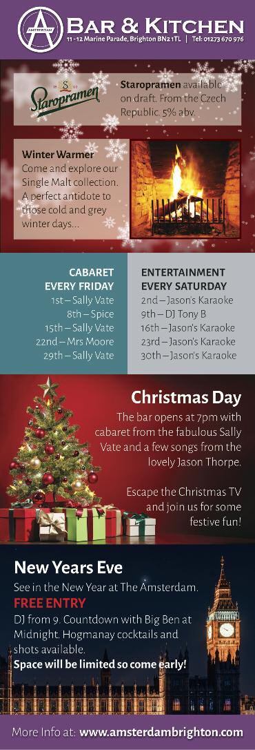 ) WORLD AIDS DAY CONCERT, St Mar y’s Church, St James Street, Brighton, doors open 7pm, concer t at 7.30pm with performances by the Actually Gay Men’s Chorus, Brighton Belles Women’s Chorus, Brighton Gay Men’s Chorus, R ainbow Chorus, R ebelles Female Voices, R esound Male Voices, Qukelele and Sweet Chilli Singers. Tickets £10, available online from www BrightonWADconcer t info and from Prowler on St James Street All proceeds to Lunch Positive