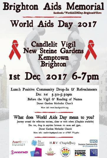 ) BRIGHTON AIDS MEMORIAL CANDLELIT VIGIL, New Steine Gardens, Brighton, from 6–7pm Everyone is welcome to attend the remembrance event for those lost to HIV/AIDS in Brighton & Hove with a Reading of Names and a Candlelit Vigil Space will be available for anyone seeking quiet moments of reflection New names to be read (in addition to those read in previous years) can be emailed to susshivchap@gmail com by November 27, or can be added to the list during the day at the Memorial Space in New Steine Gardens