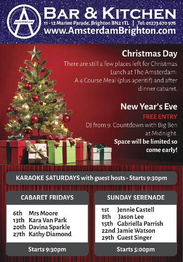 ) WAD CHARITY CONCERT @ St Mar y’s Church, St James’ St, Sun, Dec 1, doors 7pm concer t at 7.30pm Performances by: Actually Gay Men’s Chorus, Brighton Gay Men’s Chorus, R ainbow Chorus, R esound Male Voices, Sweet Chilli Singers and Qukelele Tickets £12: www.brightonwadconcer t.info or Prowler, St James’ St Capacity limited; book early All profits donated to Lunch Positive