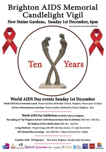 VIGIL @ New Steine Gdns, Sun, Dec 1, 6–7pm All welcome to attend the remembrance event of those lost to HIV/AIDS in Brighton & Hove for the R eading of Names and Candlelight Vigil Space available for quiet moments of reflection New names to be read (in addition to those in previous years) can be emailed to susshivchap@gmail com by Nov 27, or can be added to the list at the Memorial Space in New Steine Gdns 4–5pm on the day More info: Travis Cox or Marc Tweed on 01273 764200 or travis.cox@tht.org.uk / marc.tweed@tht.org.uk