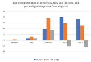 Loneliness: We asked people to choose from one of five options to describe their feeling of loneliness. We then asked what they would have answered before Covid. There was a significant drop in the percentage of those reporting ‘not at all lonely’ and ‘not so lonely’, and a consequential rise in those reporting ‘somewhat lonely’, ‘very lonely’ and ‘extremely lonely’… In short, respondents on average felt more lonely than before Covid.