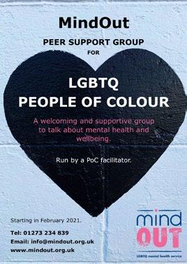 Independent, impartial services run by and for LGBTQ people with experience of mental health issues. 24 hr confidential answerphone: 01273 234839 or email info@ mindout.org.uk and out of hours online chat www.mindout.org.uk