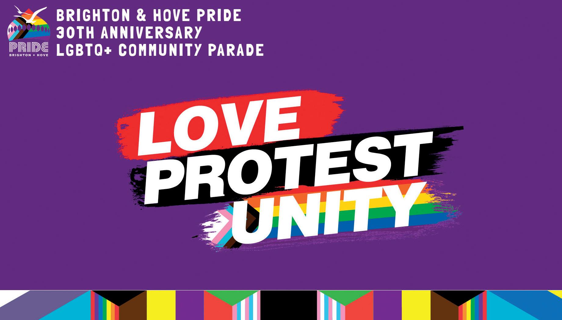 ) After two years of not being able to celebrate Pride in our city, Brighton & Hove Pride has announced the theme for the (delayed) 30th anniversary Brighton & Hove Pride LGBTQ+ Community Parade will be LOVE · PROTEST · UNITY and applications are now open via www.brighton-pride.org/pride-parade