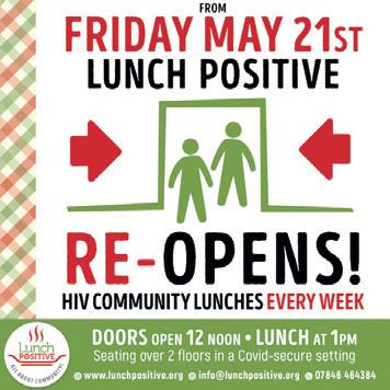 ) HIV charity Lunch Positive has reopened its HIV lunch club at Dorset Gardens Methodist Church, Brighton, which provides a weekly safe and supportive community space for people with HIV. The lunch club is put together by a fantastic team of volunteers and is provided in a Covid-secure setting. The opening of the lunch club will be followed by the reopening of the monthly evening supper group in June, which will run regularly on the second Wednesday of every month.