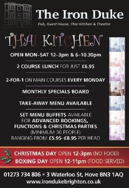 Thisyearhasseenmorerestaurantclosures thanopenings.Clearly,thisisasignofthe times.MostnotablyaroundPalmeiraSquare, with TheArtisan,whichwasonlyopened whenIreviewedlastyearisalreadyclosedand nowanItalian,allwithin12months. Harry’s, nearbyistobecome No.41,the Meadow is nowanother Bank steakandribsoutlet(64 WesternRoad,Hove),akintotheOldBankin Kemptown.Meanwhilelifegoesonwith breakfastsat TheHub (118ChurchRoad); steaksinthe RockNRoller (95WesternRoad,Brighton);the occasionalFrenchdelightat L’Eglise (196ChurchRoad,Hove);Sunday lunchesoscillatebetweenmylocal TheCrescent (6CliftonHill, Brighton),The ABar (11-12 MarineParade,Brighton),with thereturnofAlex,andmy countryescape,arevamped WickwoodsCountryClub (Shaves WoodLane,Albourne)wherethe Sundaycarveryiskeenlypriced andatableinthelandscaped garden,apositivedelight.