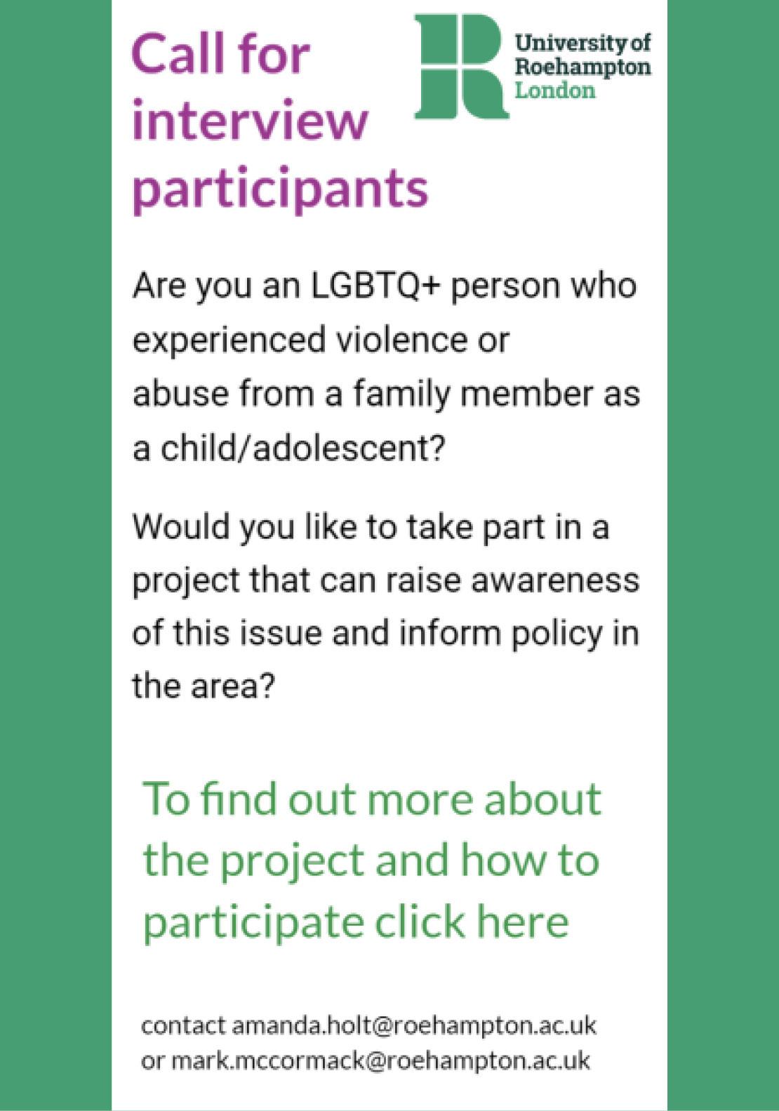 University of Roehampton seeks to interview LGBTQ+ people who have experienced some form of abuse or violence from one or more family members while growing up.