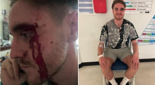 Callum Griggs, 23, was hit with a plank of wood while walking with his partner, Brad Balueta.