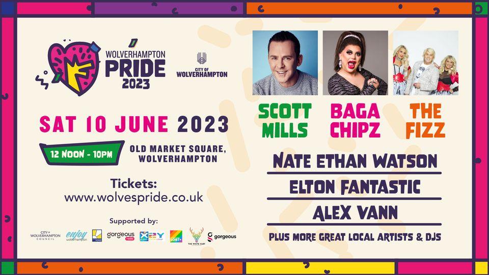 Wolverhampton Pride has announced the headline acts for the 2023 event: DJ Scott Mills, drag queen Baga Chipz and pop group and Eurovision winners, The Fizz.
