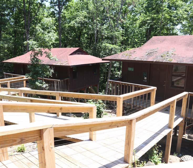 Nestled among the trees, all the unit’s buildings are connected by ramps and are completely handicapped accessible. This treehouse unit includes a kitchen (stove, refrigerator, microwave, sink) and fireplace in the shelter and a bathhouse. Each of the four treehouses has two rooms with four cot size beds.
