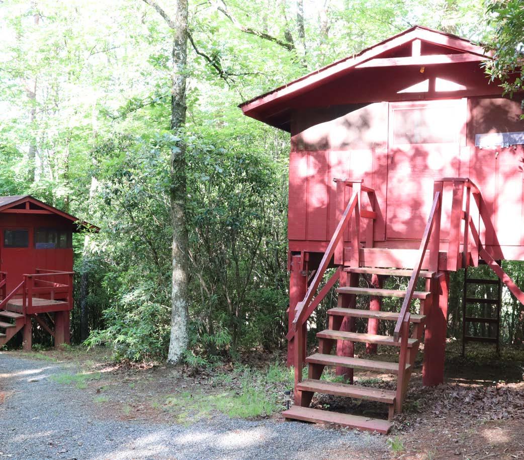 Nestled among the trees and closest to the Co-op Course, this unit consists of six screened-in cabins on stilts. Each cabin has five beds and the whole unit sleeps 25 people. This unit has a shelter with a fireplace and picnic tables, a refrigerator, bath house and a fire ring.