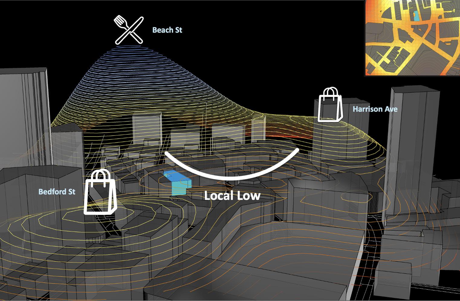 frontage with potential for reconsideration. To contextualize its surroundings, we examine a 3D heat map of ground-floor activation in the neighborhood. Areas such as Beach Street, Harrison Avenue, and Bedford Street register high levels of street-level engagement. By contrast, our site falls within a local low zone of activity — a quieter stretch with limited