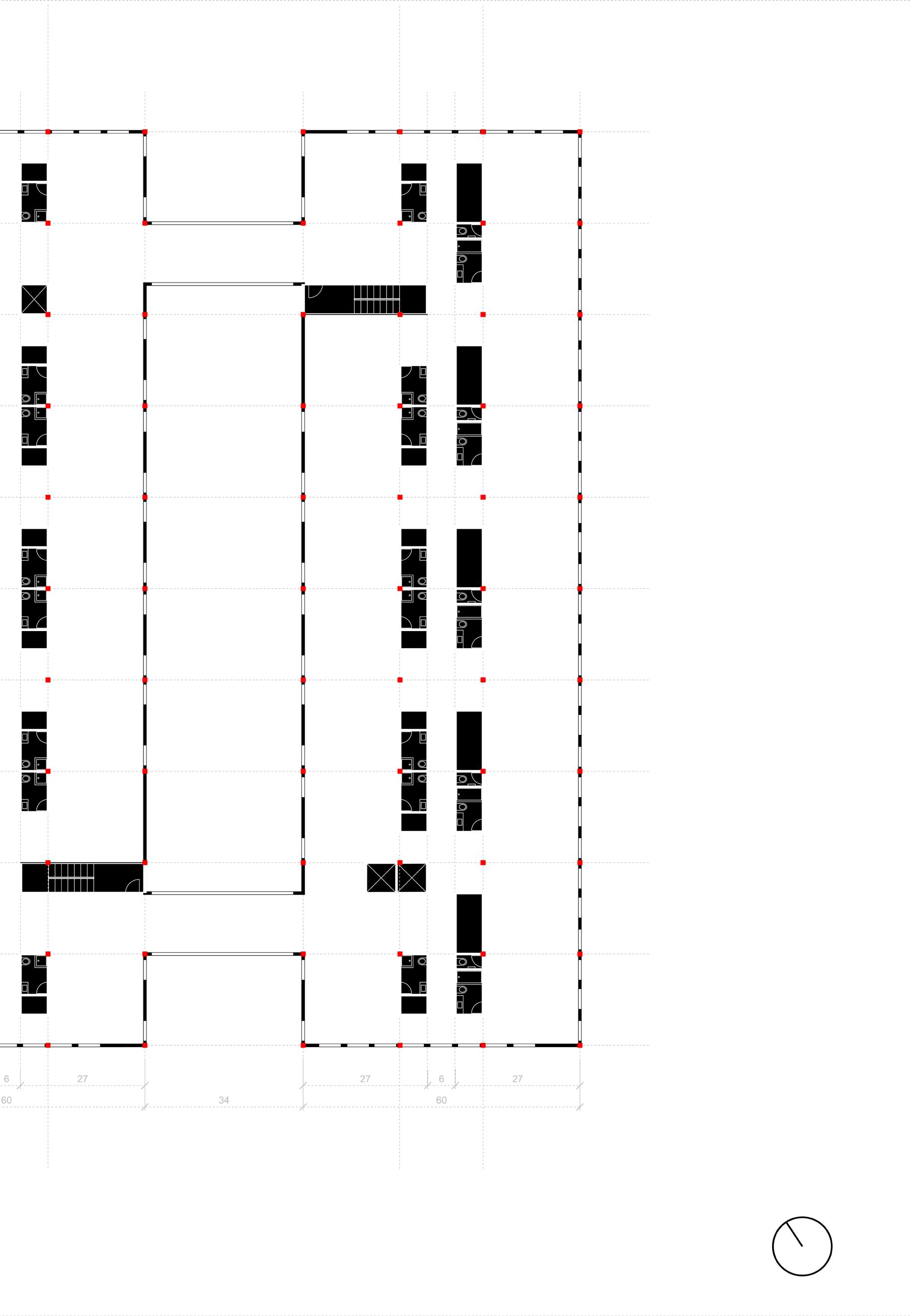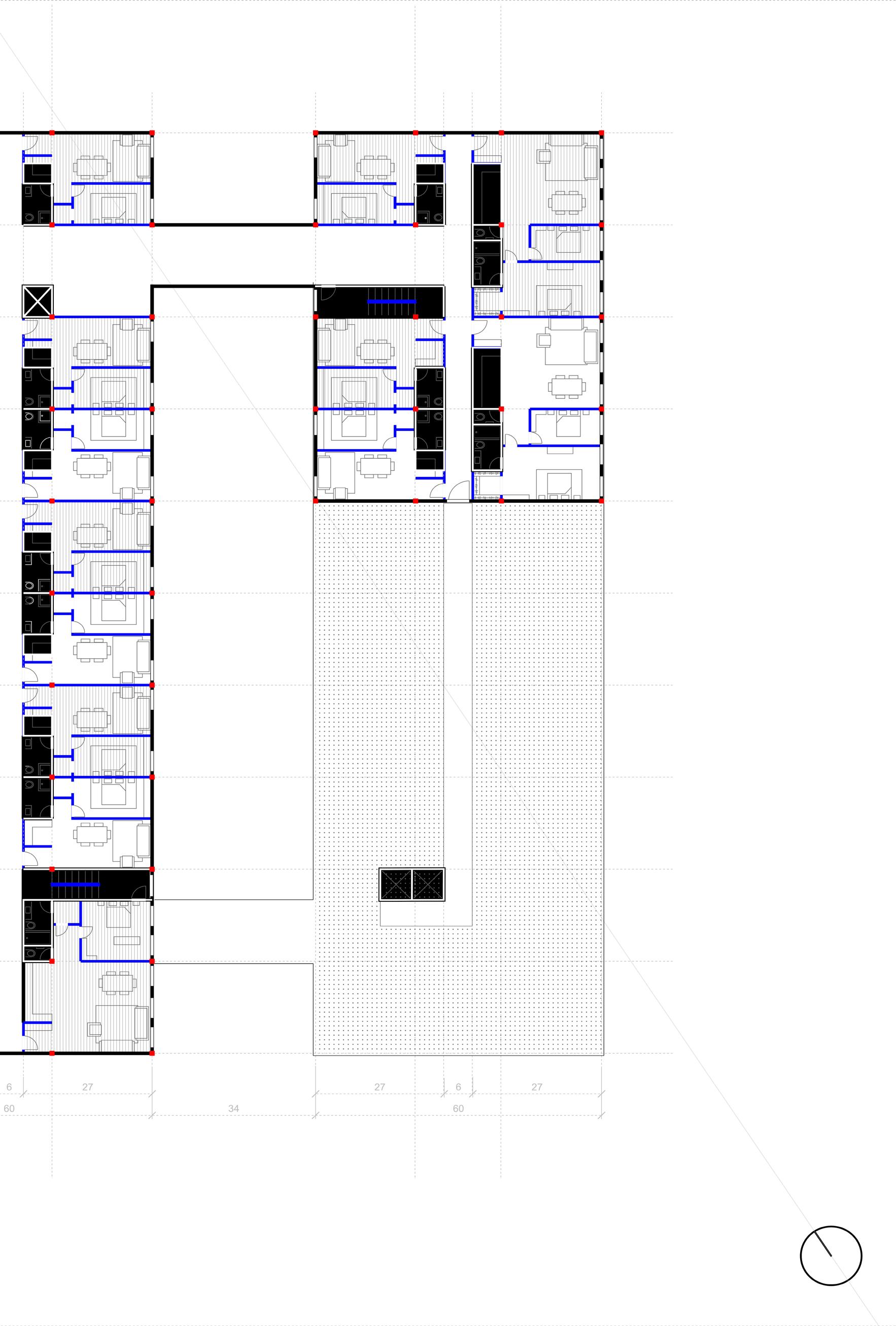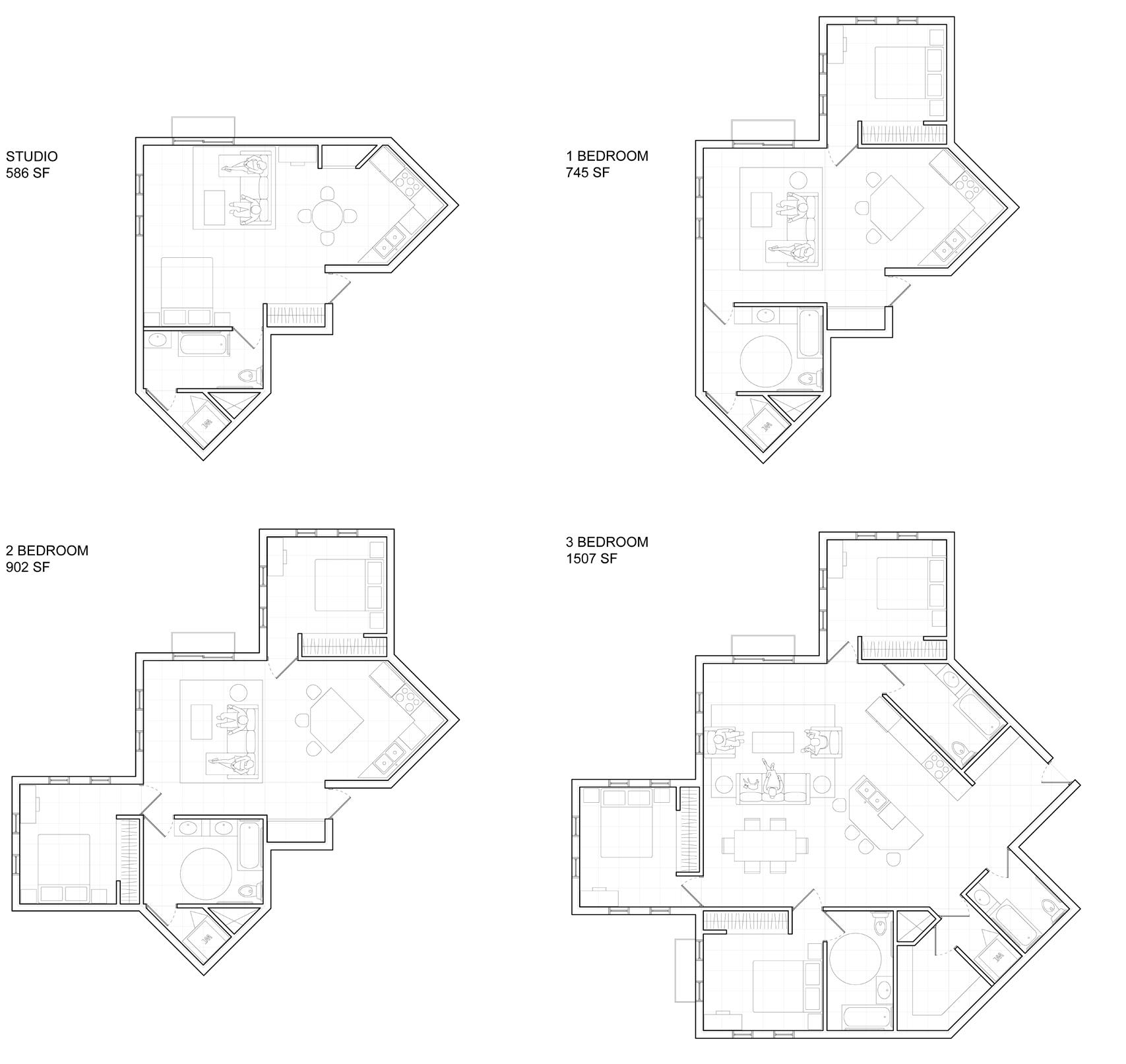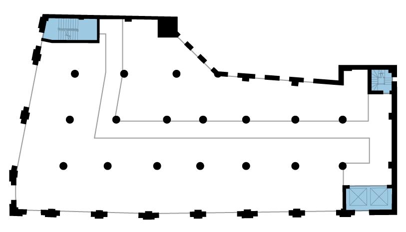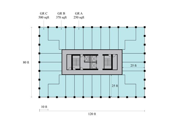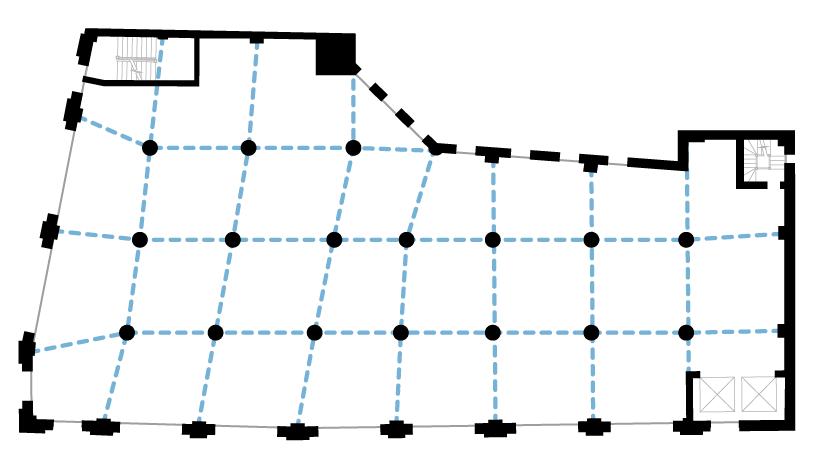 Turning to layout, we inherit a floor plan with three separated cores pushed into different corners of the structure and a non-orthogonal column grid — conditions that compromise both efficiency and usability. Our approach was to generate a series of plan variations, testing how each manages circulation, structure, and unit performance.