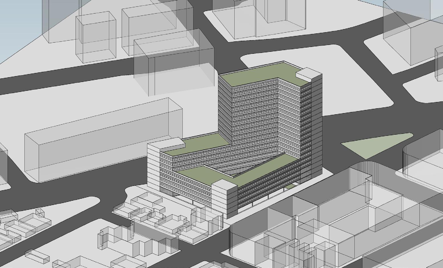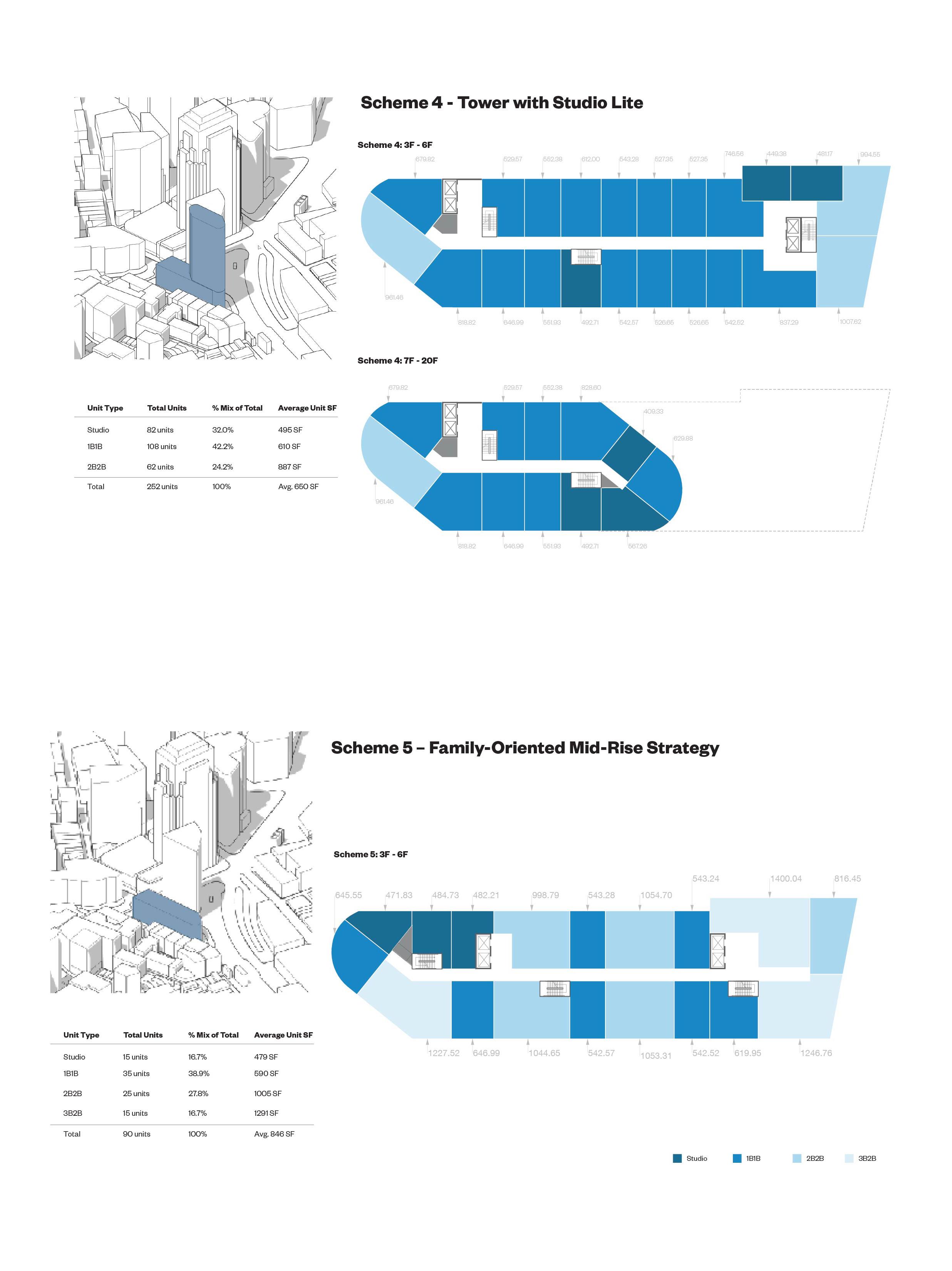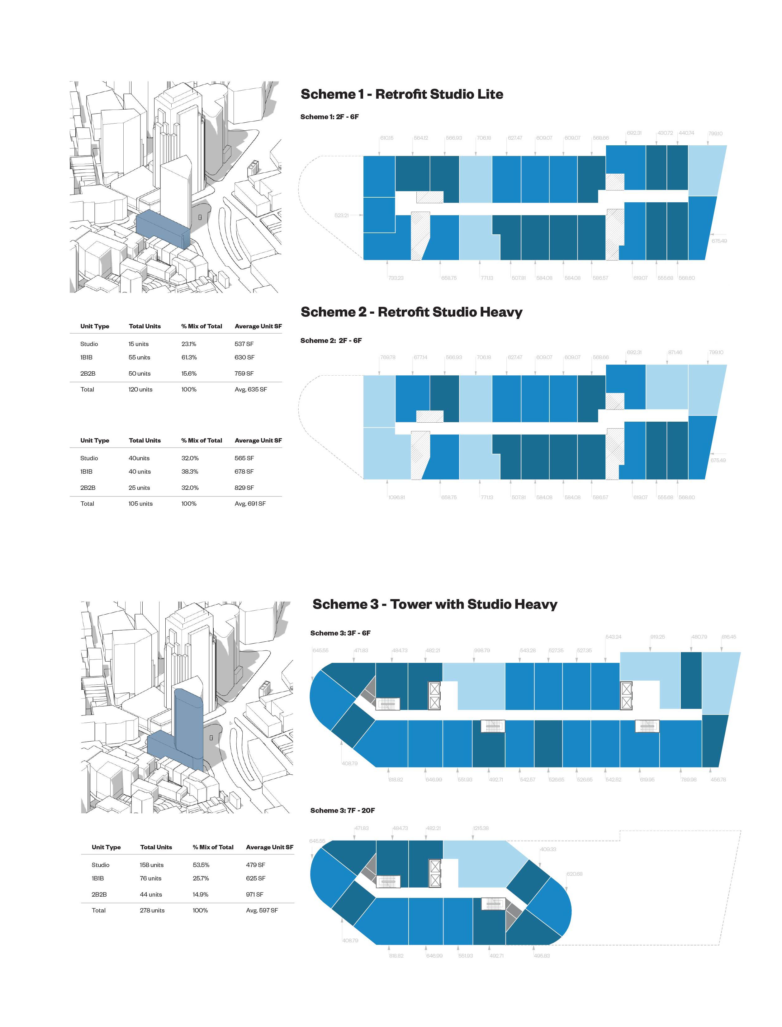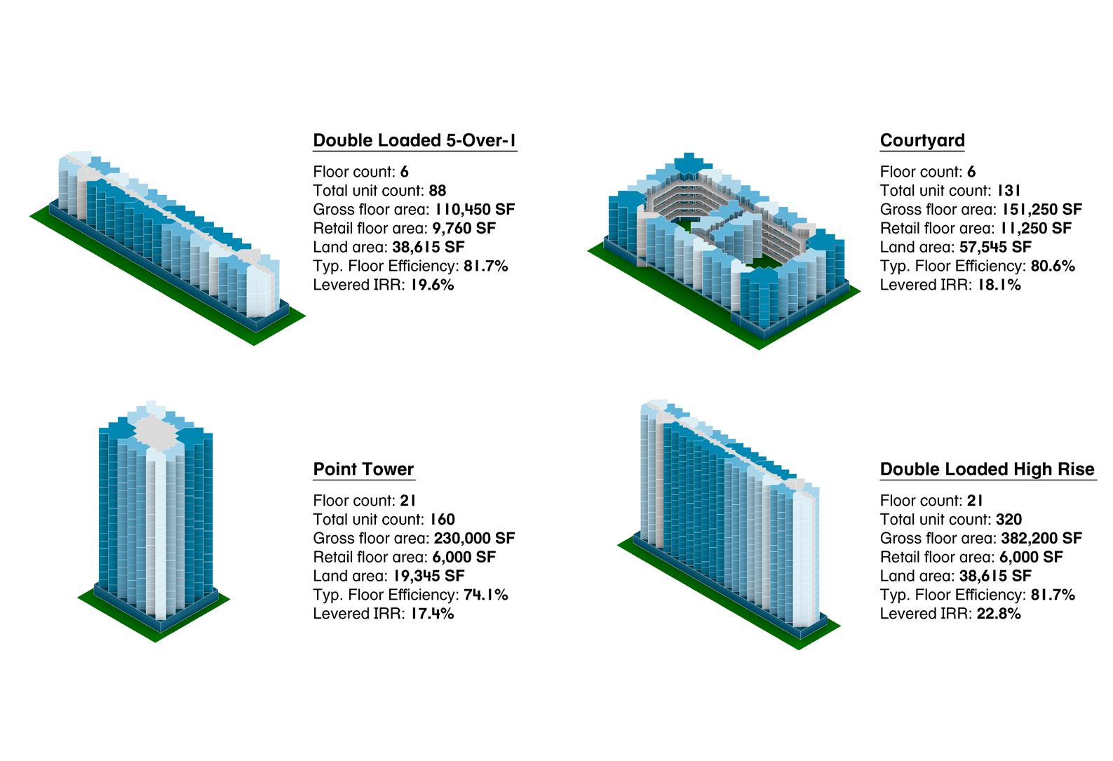 When first exploring massing strategies, we tested multiple scenarios — relocating the core to the least active edge of the site, or adding two additional floors to reach the zoning height cap. These moves were focused on increasing unit yield and driving more favorable returns. However, none of the expanded envelopes proved financially viable.