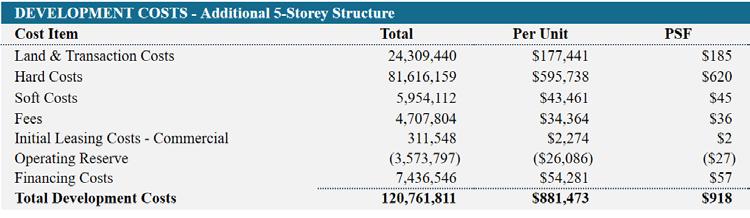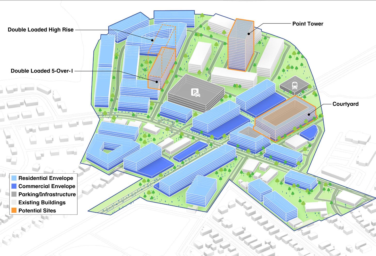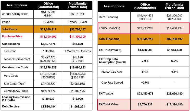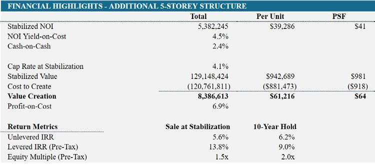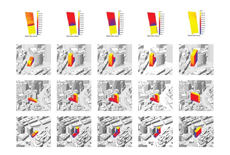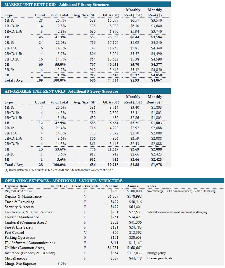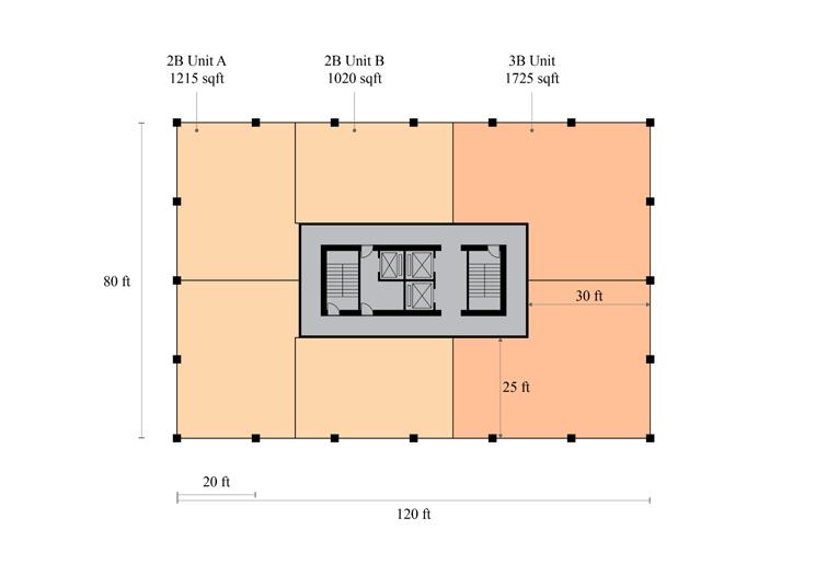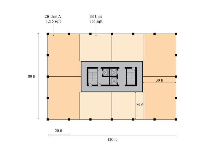 When first exploring massing strategies, we tested multiple scenarios — relocating the core to the least active edge of the site, or adding two additional floors to reach the zoning height cap. These moves were focused on increasing unit yield and driving more favorable returns. However, none of the expanded envelopes proved financially viable.