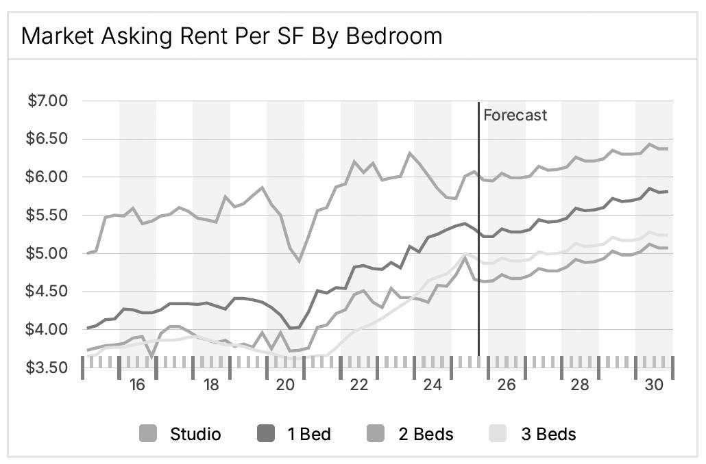 Boston’s multifamily market remains tight and relatively resilient, which underscores the need for additional rental housing. Downtown Boston has posted healthy rent growth over the past five years, with cumulative gains of roughly twenty percent2.