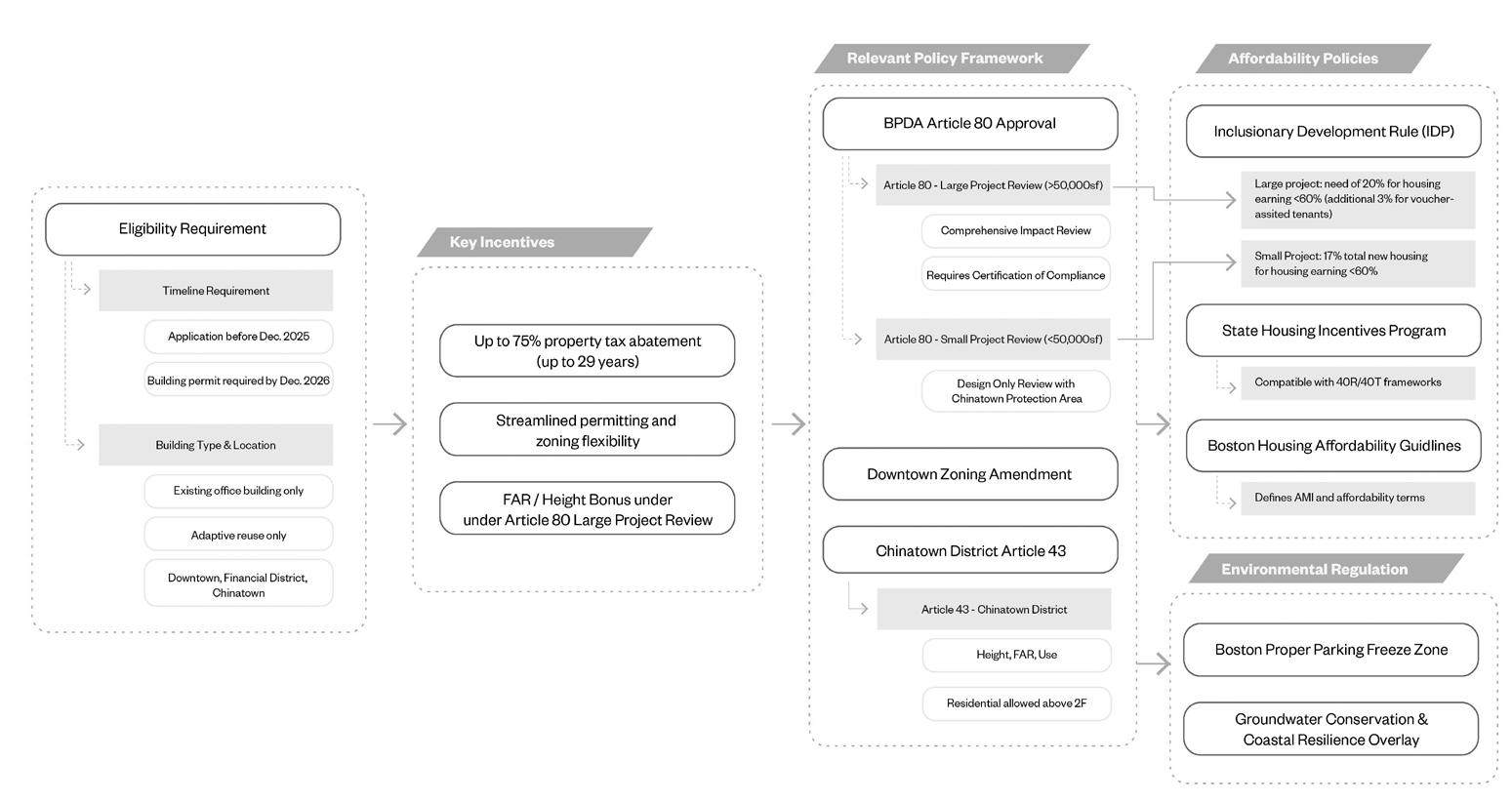 of 75 percent for 29 years, an expedited permittin track that targets building permit issuance within roughly twelve months, and a step-down in the tax rate when an asset shifts from office to residential use. Together, the underlying entitlements and these programmatic benefits reduce entitlement risk, improve after-tax cash flow, and make an adaptive reuse of 73 Essex more feasible.