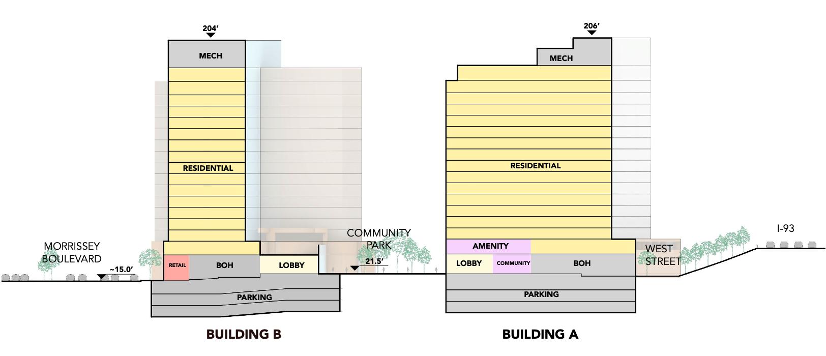 The site sits in a Community Commercial zoning district, with allowable heights in the roughly 80- to 100-foot range and floor area ratios on the order of six to seven. On top of the base zoning, Boston’s Office to Residential Conversion Program layers on a set of powerful incentives: a long-term property tax abatement