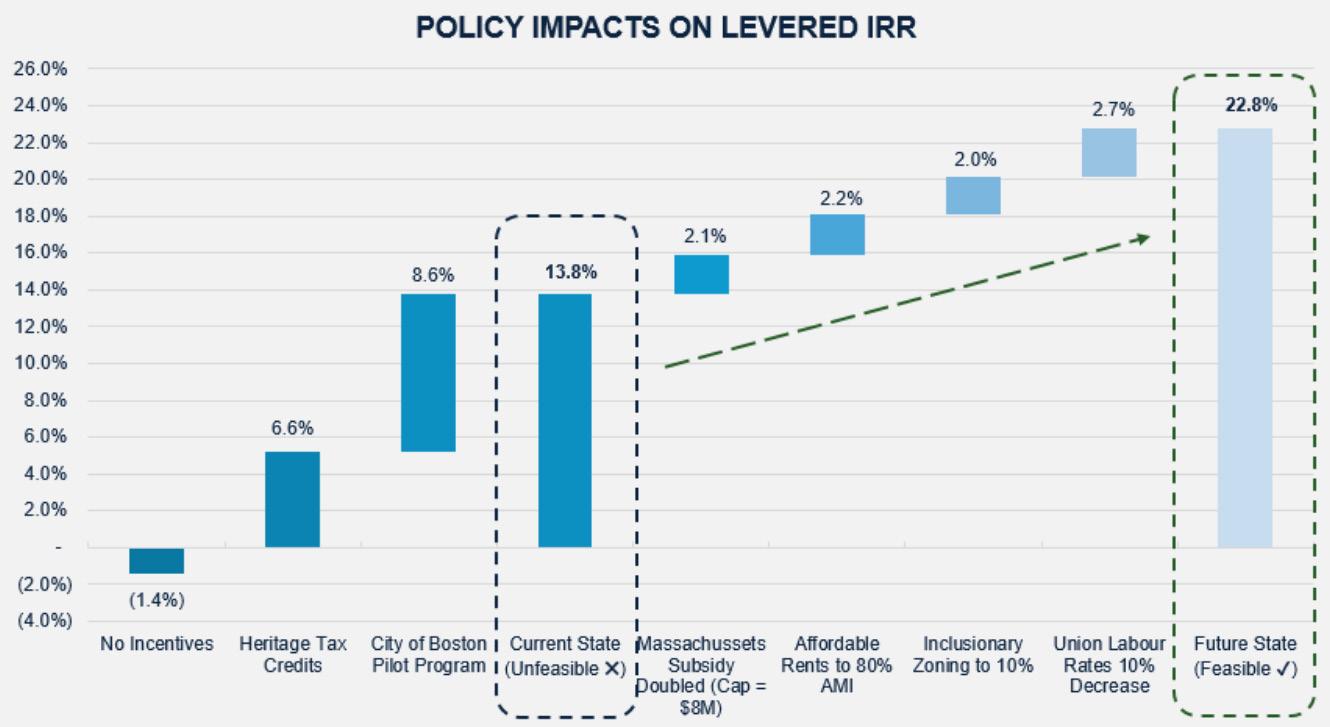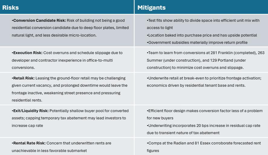 Policy support is the other piece that draws this project closer to being financially viable. Boston’s Office to Residential Conversion Program offers a 75% tax abatement for 29 years. It also offers expedited project approvals that allow building permits to be issued within 12 months and a step down in tax rate from office to residential. Together, these tools improve cash flow and reduce entitlement risk enough to attract private capital into a nichey, execution-heavy asset class. Directing this framework toward multifamily housing also ties the project back to the city’s broader housing and affordability goals. The program at 73 Essex adds 79 new units, including 14 affordable units, in the country’s 10th most unaffordable city1.