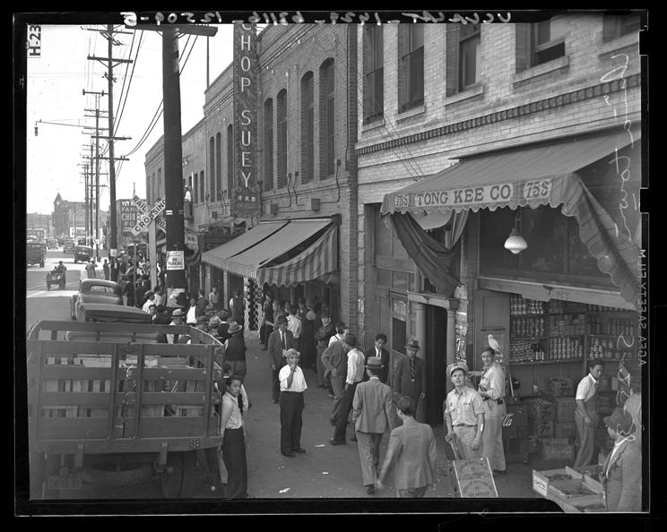 8 Crowds gather in 700-block North Alameda Street after police raids in Los Angeles, Calif., 1938. 25 May 1938.
