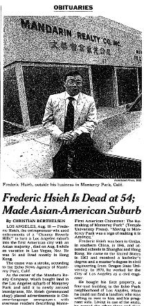 3 Berthelsen, Christian. “Frederic Hsieh Is Dead at 54; Made Asian-American Suburb.” The New York Times, 20 Aug. 1999, p. C16.