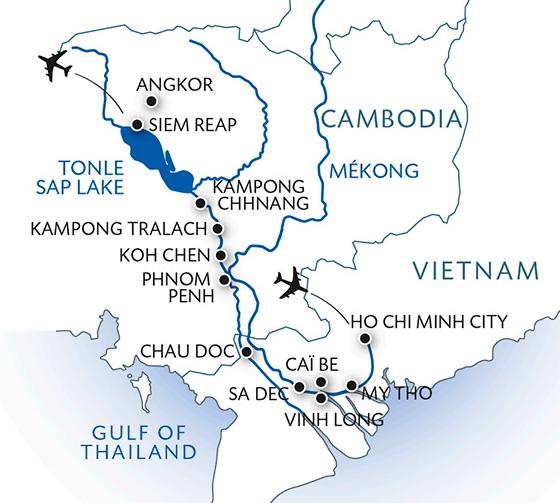 There can be no tapestry of river life as fascinating and varied as the River Mekong. Indeed there can be no more striking a cultural contrast as that between the bustling Vietnam delta and the tranquility of Cambodia. We pass from the vibrant French colonial port of Saigon, through the vast delta so rich in human life and endeavour, to travel along the main channel into the rich countryside of Cambodia. With a full day in charming Phnom Penh we then explore more remote waterways as we progress to the great monuments of Angkor and a two night stay at the 5 star Sofitel Angkor Hotel.