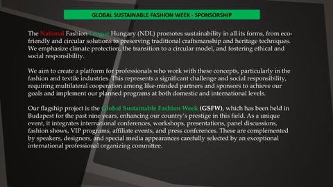 Founded in 2015 by the National Fashion League Hungary, Global Sustainable Fashion Week (#GSFW) has grown into Central Europe’s premier platform for ethical fashion. Held annually, our event bridges the gap between heritage and innovation through a high-level International Conference, specialized workshops, and a prestigious International Eco-Fashion Show. Each edition features a curated selection of side events—from exhibitions to panel talks—focused on the industry's most pressing sustainability challenges. Follow our Issuu profile to explore our official programs, trend reports, and deep dives into circular design. ?? Website: gsfashionweek.com